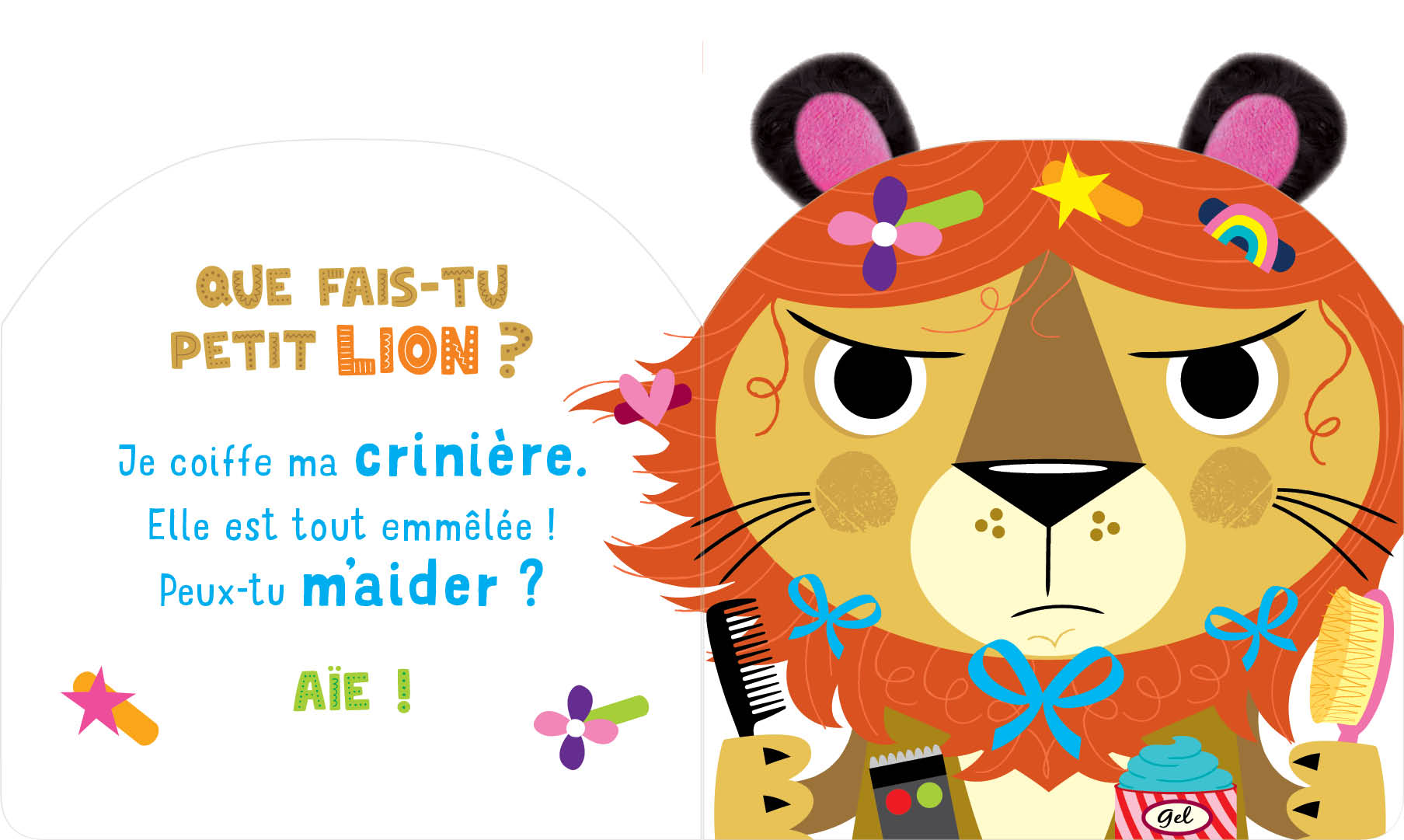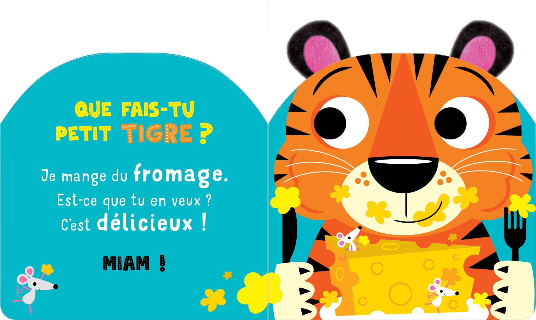 Des animaux très rigolos coiffés d’oreilles en peluche, des questions pour favoriser l’interactivité, des rimes et des onomatopées pour encourager les premiers mots…