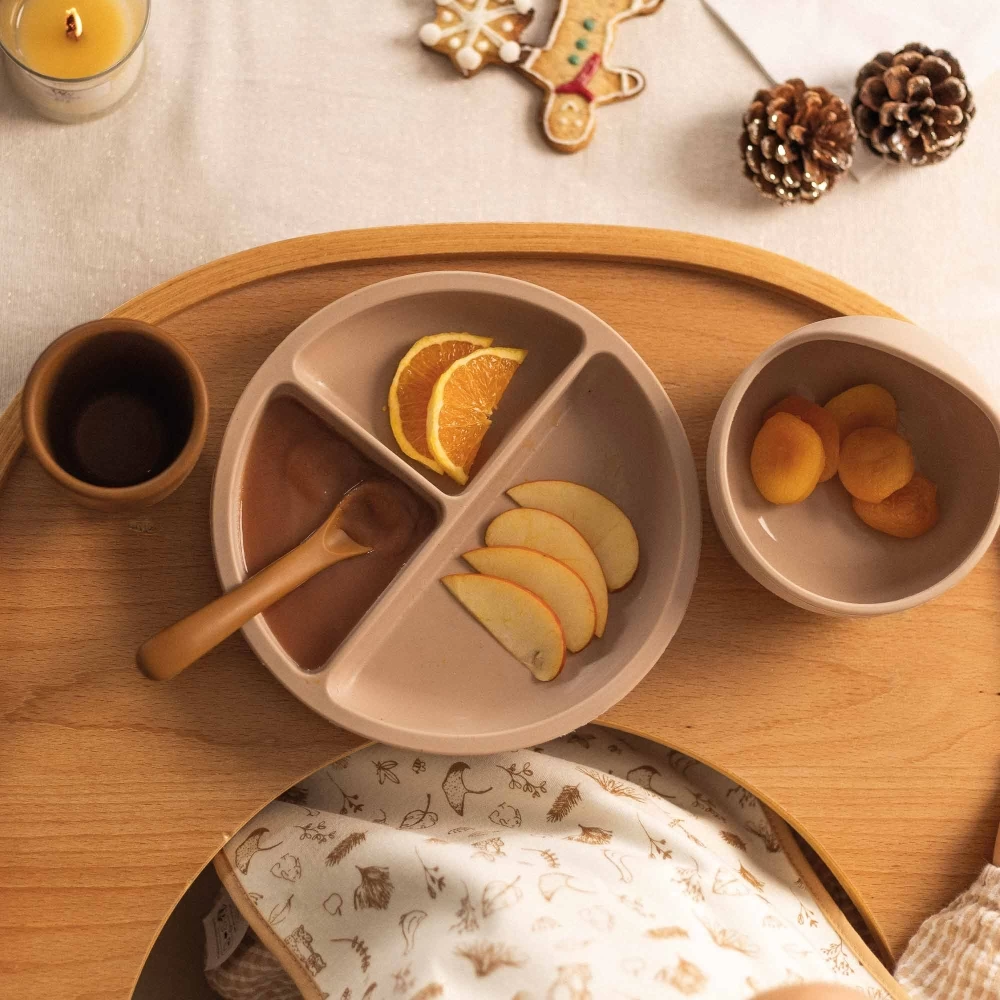 Ce coffret repas 4 pièces en silicone est conçu pour accompagner les premiers repas de bébé avec praticité et confort. Fabriqué entièrement en silicone, il combine durabilité, sécurité et douceur pour les gencives sensibles des tout-petits. Résistant aux taches et facile à nettoyer, il est idéal pour un usage quotidien. Le coffret comprend un bol pour les purées, un verre pour apprendre à boire de manière autonome, une cuillère douce pour les premières bouchées, et une assiette pour les petites portions. Les pièces sont ergonomiques, facilitant la prise en main des parents et des enfants. Disponible dans des teintes modernes de vert sauge et vert sapin, ce coffret s’intègre facilement dans toutes les cuisines. De plus, il est compatible avec le lave-vaisselle, offrant une solution de nettoyage rapide et pratique pour les parents. Un choix parfait pour rendre l’heure du repas agréable et fonctionnelle.