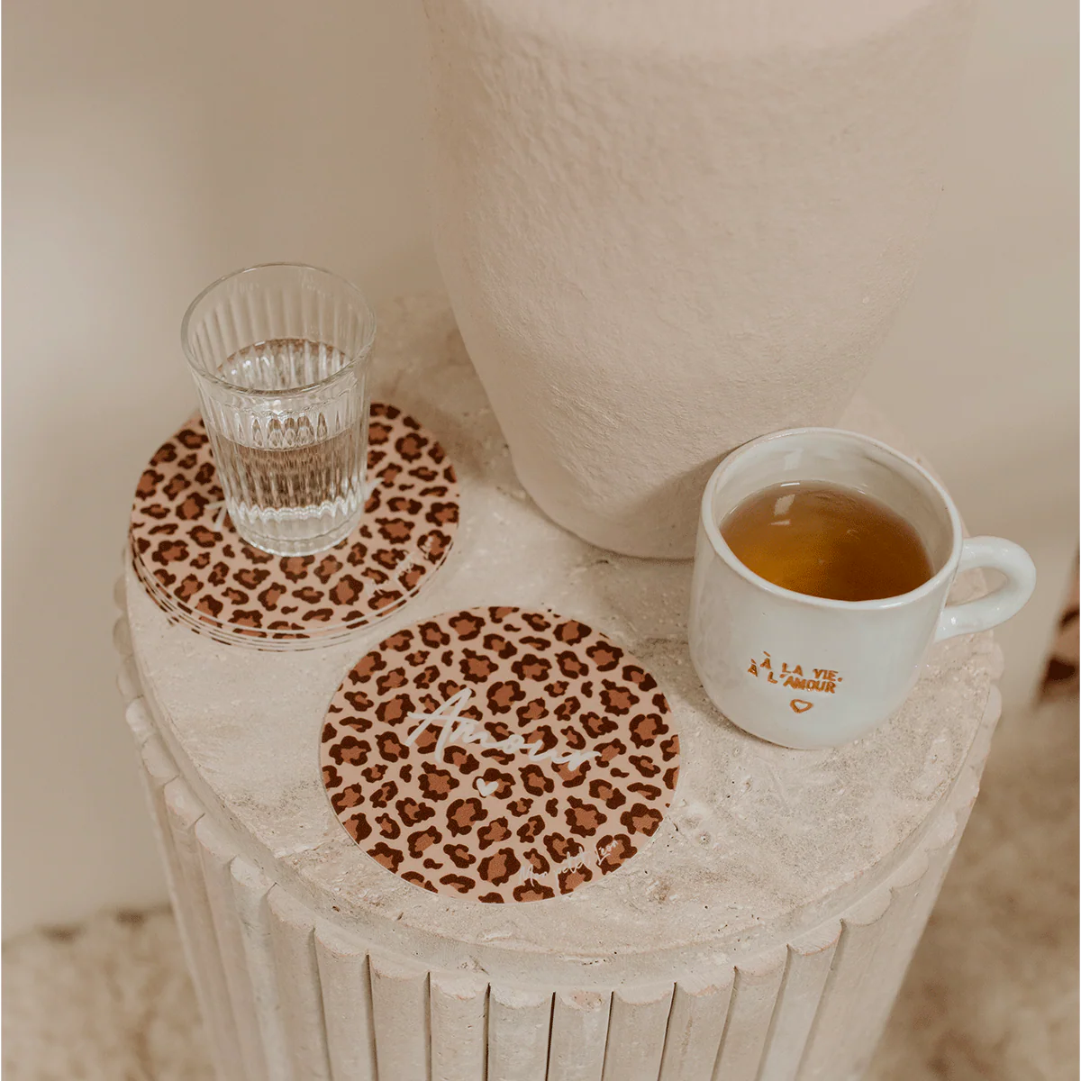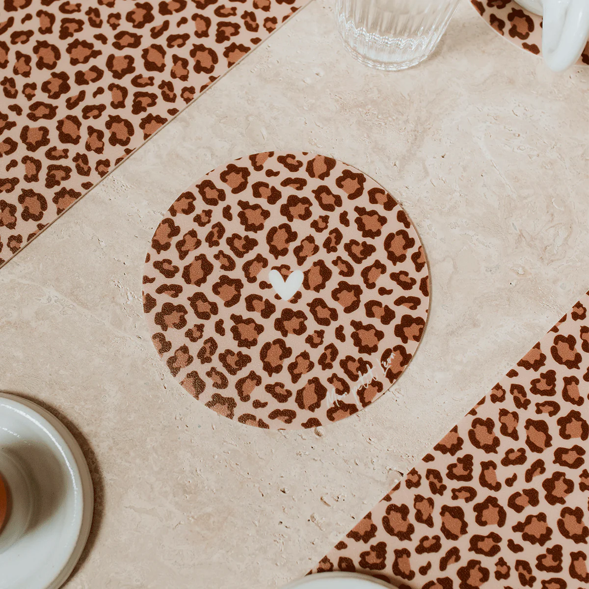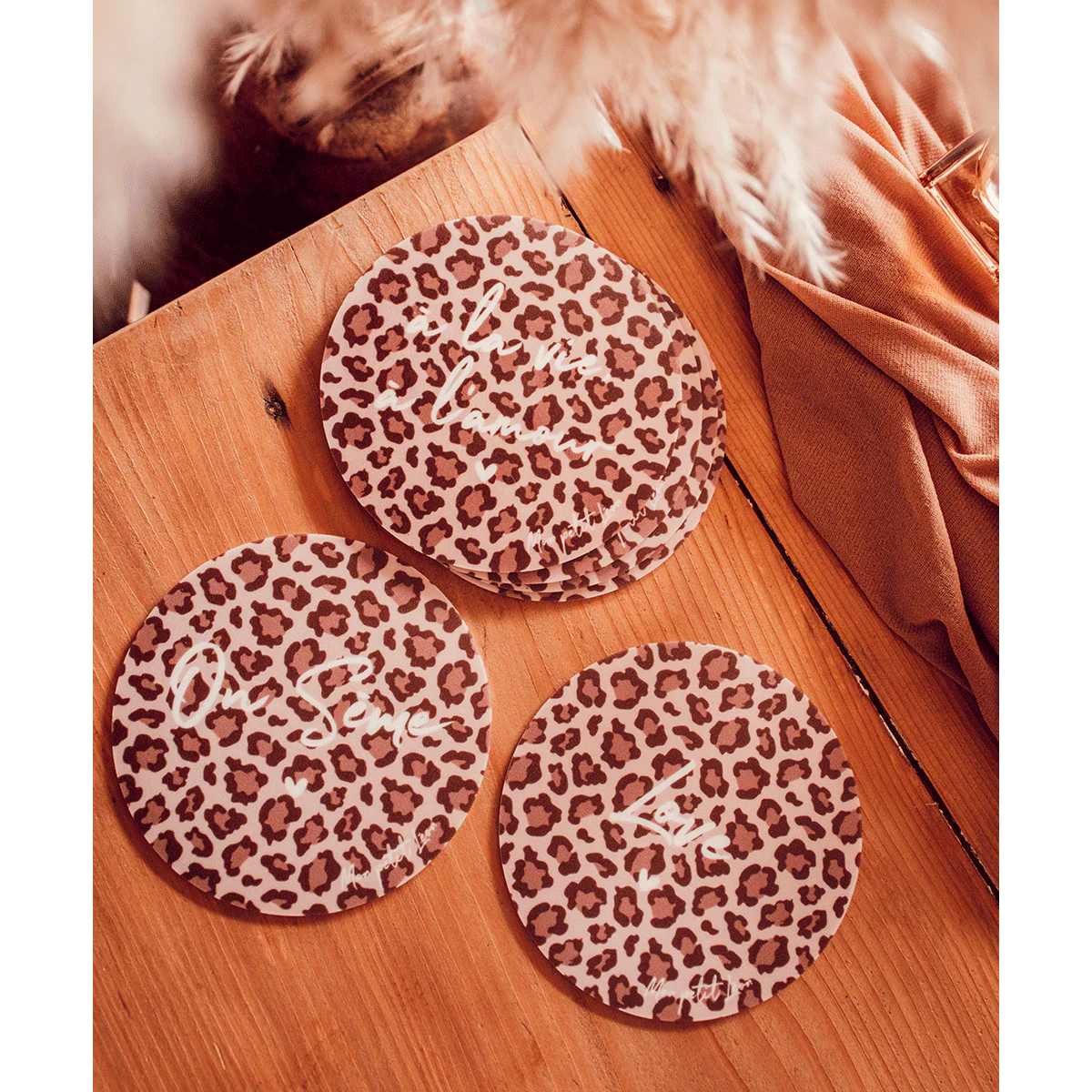 Protégez et décorez votre table avec style grâce à nos dessous de verre vinyle avec notre motif iconique léopard et l’inscription de votre choix dans la liste de nos messages iconiques ♡