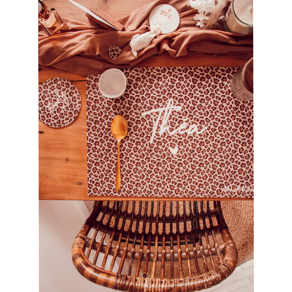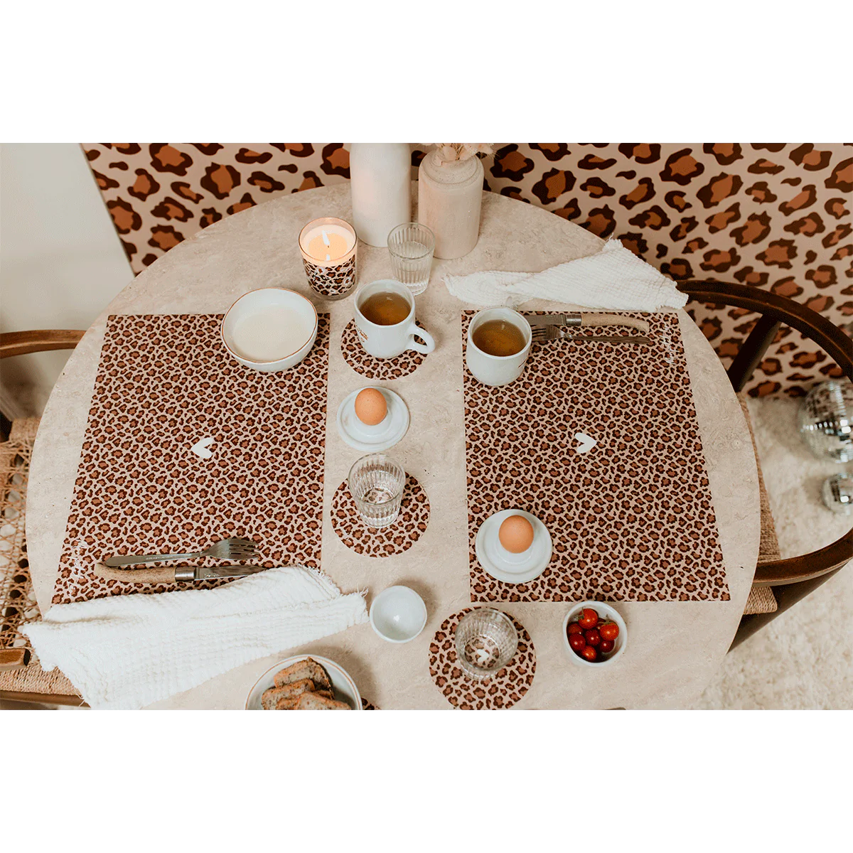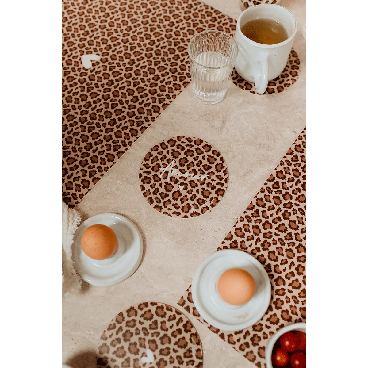Protégez et décorez votre table avec style grâce à nos dessous de verre vinyle avec notre motif iconique léopard et l’inscription de votre choix dans la liste de nos messages iconiques ♡