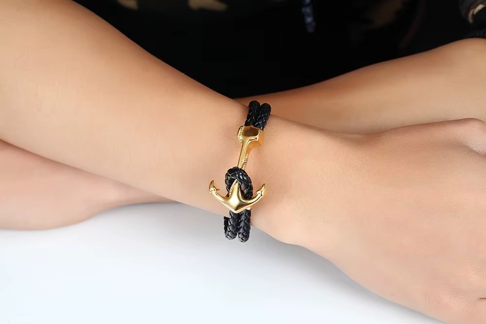 L’ancre marine bracelet se distingue par son cordon en cuir tressé double couche. Ce choix assure une durabilité exceptionnelle. Le cuir vieillit avec élégance, gagnant en patine avec le temps. La breloque en forme d’ancre en acier inoxydable ajoute une touche iconique. Résistante à l’eau et aux frottements, elle garde son éclat des années.