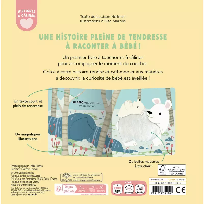 Ce premier livre à toucher et à câliner est parfait pour le coucher de bébé. Avec une histoire tendre et rythmée et des matières à toucher, il éveille la curiosité de bébé tout en créant un moment apaisant avant le sommeil.