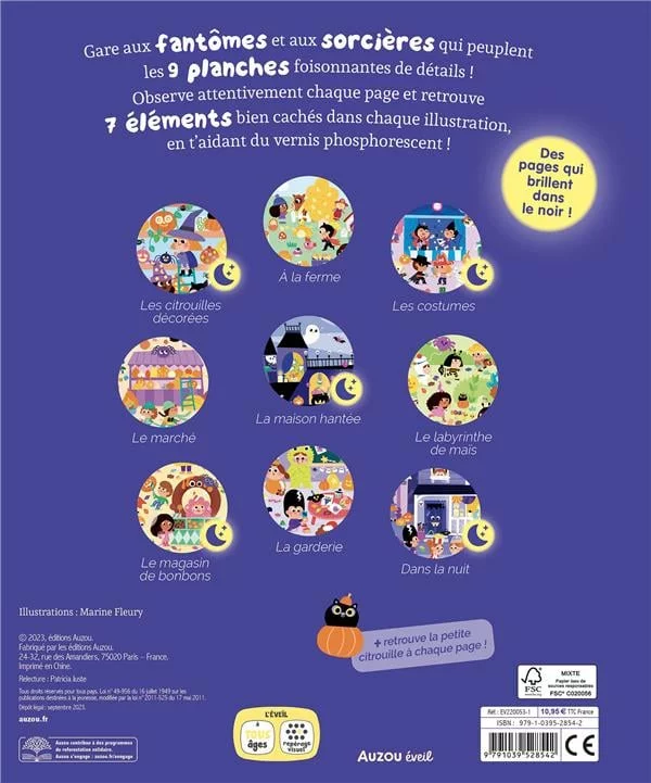 À travers neuf planches richement illustrées, les enfants se lancent dans une aventure captivante à la découverte de lieux hantés et délicieusement effrayants. Chaque planche regorge de détails mystérieux où les jeunes explorateurs doivent retrouver sept éléments bien dissimulés, ainsi que la mascotte. Parmi ces éléments se cachent de gentils fantômes, des vampires amusants, des citrouilles vivantes et des sorcières pleines de malice. Grâce à un vernis phosphorescent, les petits détectives peuvent révéler des secrets cachés dans l’obscurité, rendant l’expérience encore plus magique et immersive. Une véritable invitation à l’imagination et à l’observation !