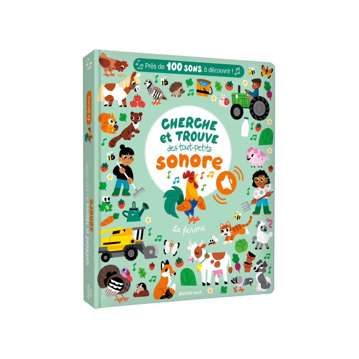 Sur chaque double-page, l’enfant explore différents lieux de la ferme : la basse-cour, l’étable, le pré… et doit retrouver 6 animaux ainsi qu’une mascotte cachée dans chaque univers. Chaque animal est associé à un bruit spécifique, ce qui permet de stimuler l’écoute et la concentration de manière ludique et interactive.
