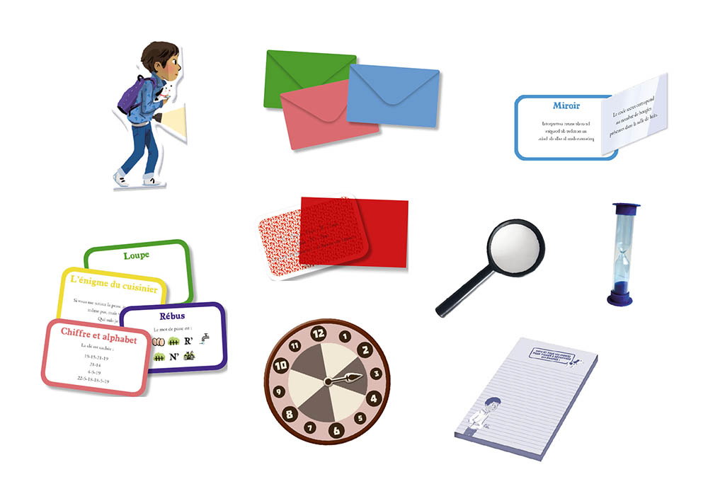 Chaque salle renferme un défi unique : rébus, morse, charade, code secret… À toi de découvrir comment les décoder à l’aide des accessoires de détective fournis : loupe, carte miroir, morse et filtre rouge. Trouve la bonne réponse pour progresser, mais attention : si tu te trompes, l’aiguille de l’horloge avancera d’un cran et tu te rapprocheras du terrible fantôme de Guillaume de Rébusse !