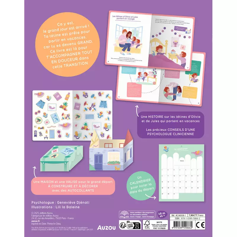 L’enfant commence par choisir une date de départ à noter sur le calendrier inclus. Il construit ensuite une petite maison à décorer avec les autocollants fournis, pour y déposer sa tétine pendant la journée. Le moment venu, il prépare une valise spéciale, elle aussi à monter et à personnaliser, pour confier sa tétine aux parents le jour J.