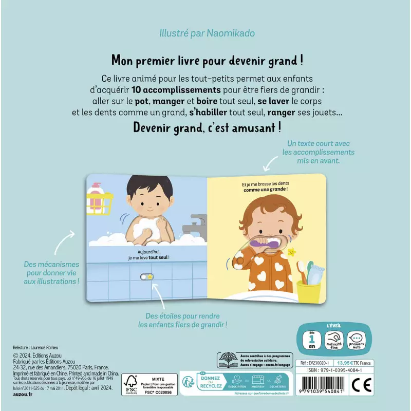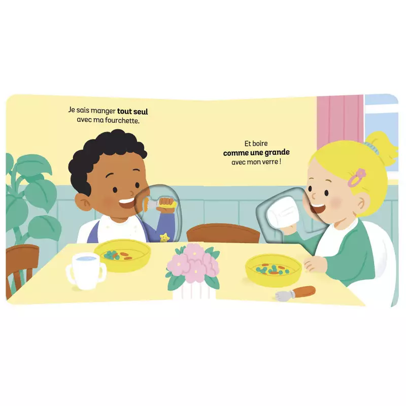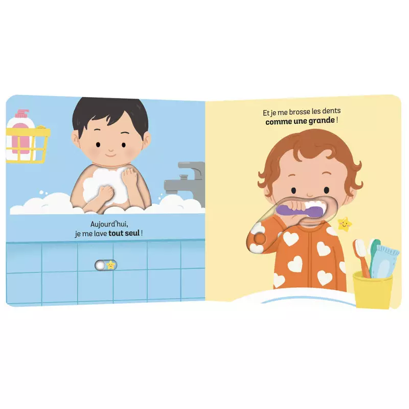 L’enfant explore 10 rituels favorisant son développement, activables par des actions simples. Grandir devient une aventure amusante ! Ces 10 étapes incluent : Utiliser le pot en autonomie, se laver seul, se brosser les dents, manger et boire sans aide, s’habiller sans assistance, abandonner la tétine, ranger ses affaires, aller à l’école et dormir dans un lit pour grands.