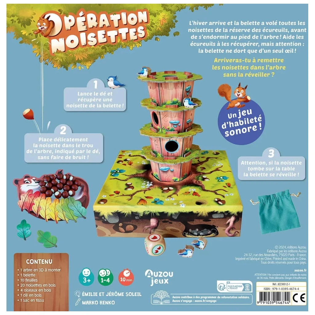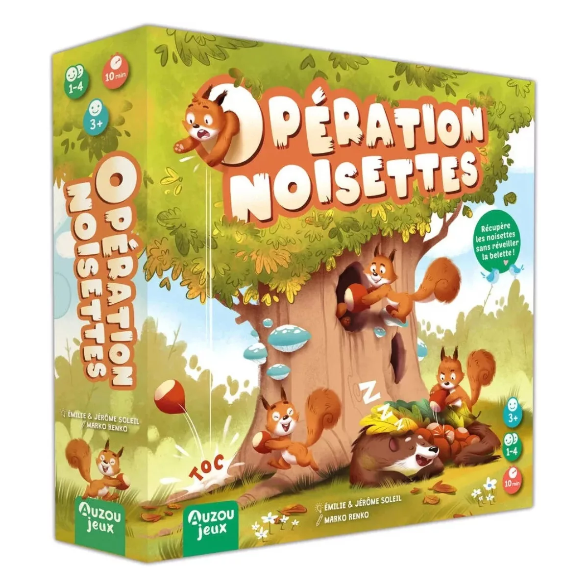 Oh non, l’hiver approche et la belette a volé toutes les noisettes des écureuils avant de s’endormir au pied de l’arbre ! Dans le jeu Opération Noisettes, il faudra vite aider les écureuils à récupérer leur précieuse réserve, mais attention, la belette ne dort que d’un œil ! Le but du jeu est de remettre toutes les noisettes dans l’arbre sans réveiller la belette.
