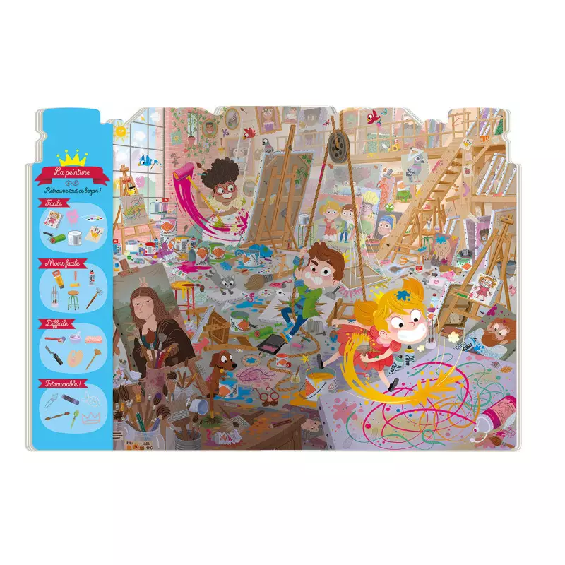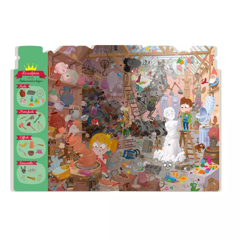 Plonge dans l’univers artistique de l’atelier de la comtesse avec ce passionnant jeu de cherche et trouve ! Sauras-tu t’y retrouver dans cet immense fouillis ? Avec 26 éléments à retrouver, ce jeu met à l’épreuve ton sens de l’observation dans divers lieux emblématiques de l’atelier : le cours de dessin, la sculpture, le studio photo, la peinture, l’imprimerie et la grande salle d’exposition.
