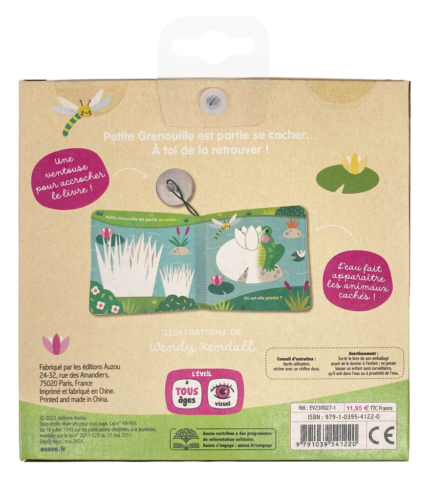 Suivez la petite grenouille qui joue à cache-cache dans la mare ! Sur chaque page, l’enfant interagit avec l’histoire : en plongeant son livre dans l’eau, des zones blanches (de peinture magique) disparaissent et découvrent des éléments cachés !