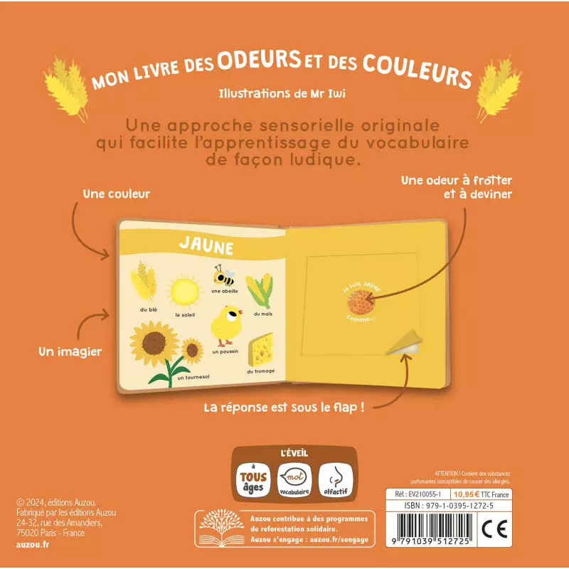 Conçu pour une utilisation autonome, ce livre encourage les enfants à développer leurs capacités d’observation et leur mémoire olfactive tout en s’immergeant dans un monde visuel captivant. Chaque page devient une aventure sensorielle, où les sens de la vue, de l’odorat et du toucher se combinent pour offrir une expérience d’apprentissage complète et stimulante.