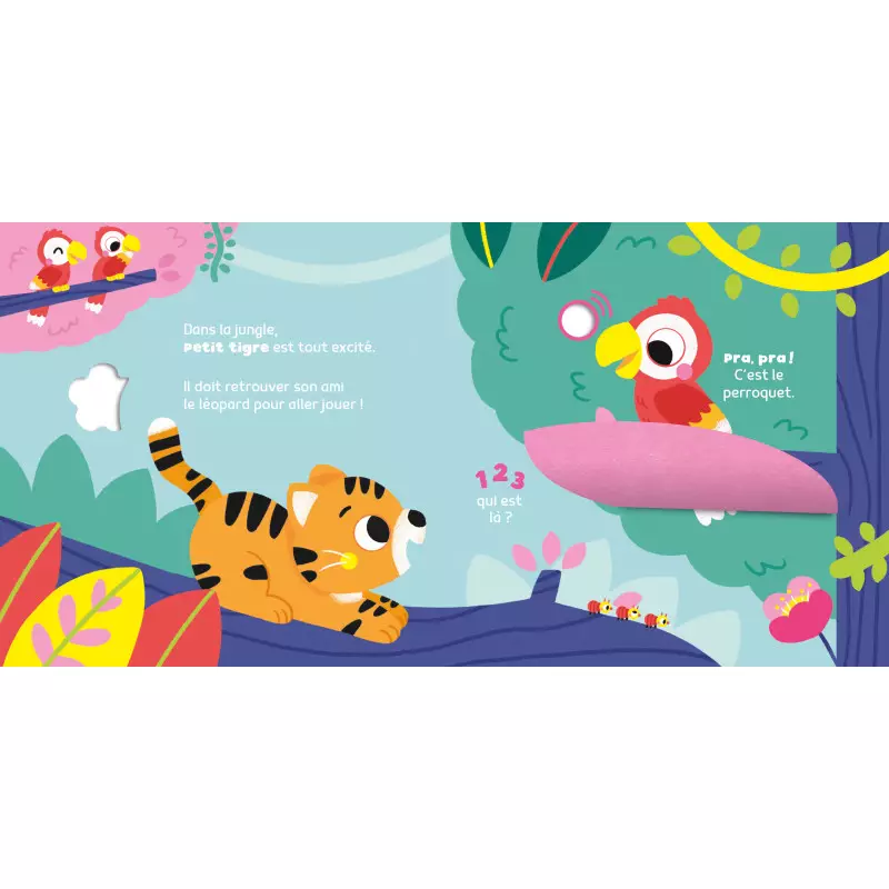 Un adorable livre sonore et interactif pour les tout-petits : aide Petit Tigre à retrouver son ami léopard en soulevant les flaps en feutrine et en écoutant les sons des animaux de la jungle !