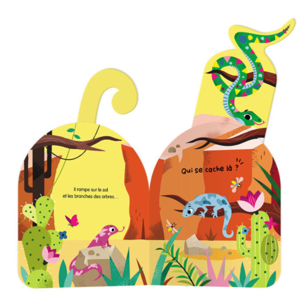 4 queues et 1 paire d’oreilles d’animal dépassent de ce livre animé en carte épaisse. Qui se cache là ? Tirer sur la queue d’un animal fait « sortir » l’animal et déclenche un son : le cri de l’animal correspondant. Dans ce jeu de coucou-caché, le dernier animal se présente dans une posture rigolote. Il faut tirer sur le haut de sa tête pour découvrir une grenouille stupéfaite… la tête en haut ! Un livre animé solide, une thématique passion pour les plus petits, le fondamental jeu du coucou-caché, des surprises sonores et visuelles et un dernier animal encore…
