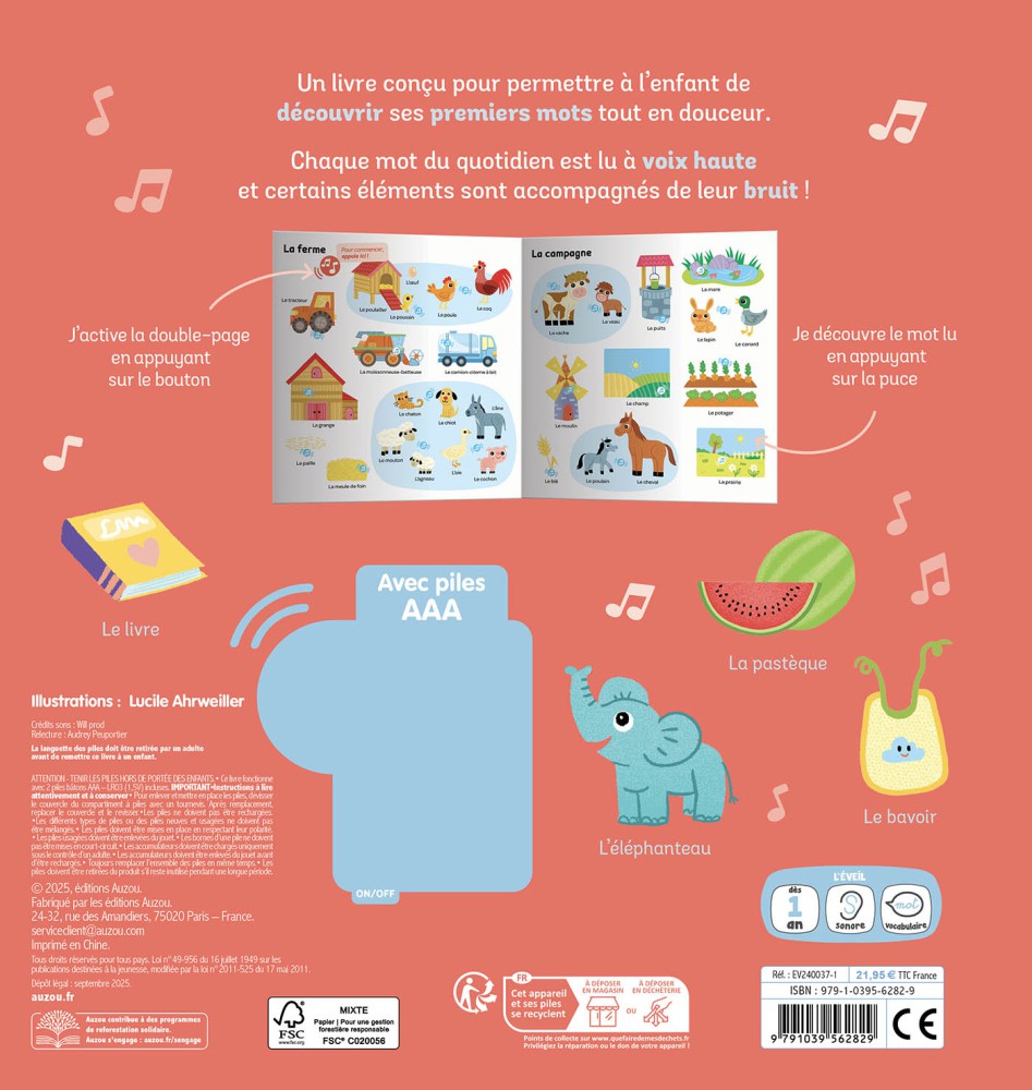 Avec son format adapté aux tout-petits, l’enfant découvre en douceur ses premiers mots. Chaque mot du quotidien est lu à voix haute et 50 d’entre eux sont accompagnés de leur bruit ! Les 500 mots sont regroupés en univers simples et adaptés aux plus petits (corps, maison, repas, saisons, couleurs et formes, etc). L’imagier est un incontournable dans les premières lectures de bébé : cela permet de montrer, nommer et reconnaître les éléments de leur quotidien.