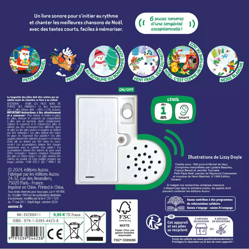 Les enfants adoreront découvrir d’autres comptines comme Vent frais, vent du matin, Noël, c’est comme un rythme de jazzet Neige blanche, qui éveilleront leur curiosité et leur sensibilité musicale. Ce livre est une manière ludique d’introduire les tout-petits à la musique et à la culture de Noël, favorisant à la fois l’apprentissage et l’amusement. Offrez à vos enfants un Noël mémorable rempli de mélodies et de rires !