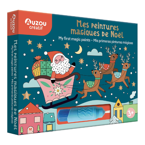 Une activité magique sur le thème de Noël ! Remplis le gros pinceau magique d’eau, passe-le sur les dessins et regarde les couleurs de Noël apparaître comme par enchantement ! Sapins, cadeaux et lutins prennent vie sous tes yeux… puis les couleurs disparaissent en séchant, pour recommencer à l’infini. Une activité propre, simple et réutilisable, idéale pour les enfants dès 3 ans. Le pinceau à réservoir d’eau, visible à travers la fenêtre du coffret, donne tout de suite envie de créer ! Contenu : 8 tableaux magiques + 1 pinceau à réservoirThème : NoëlÀ faire et à refaire sans se…