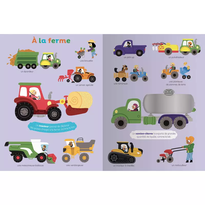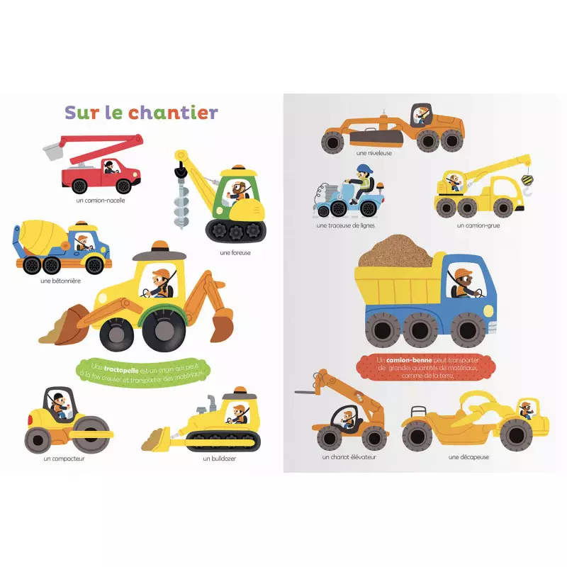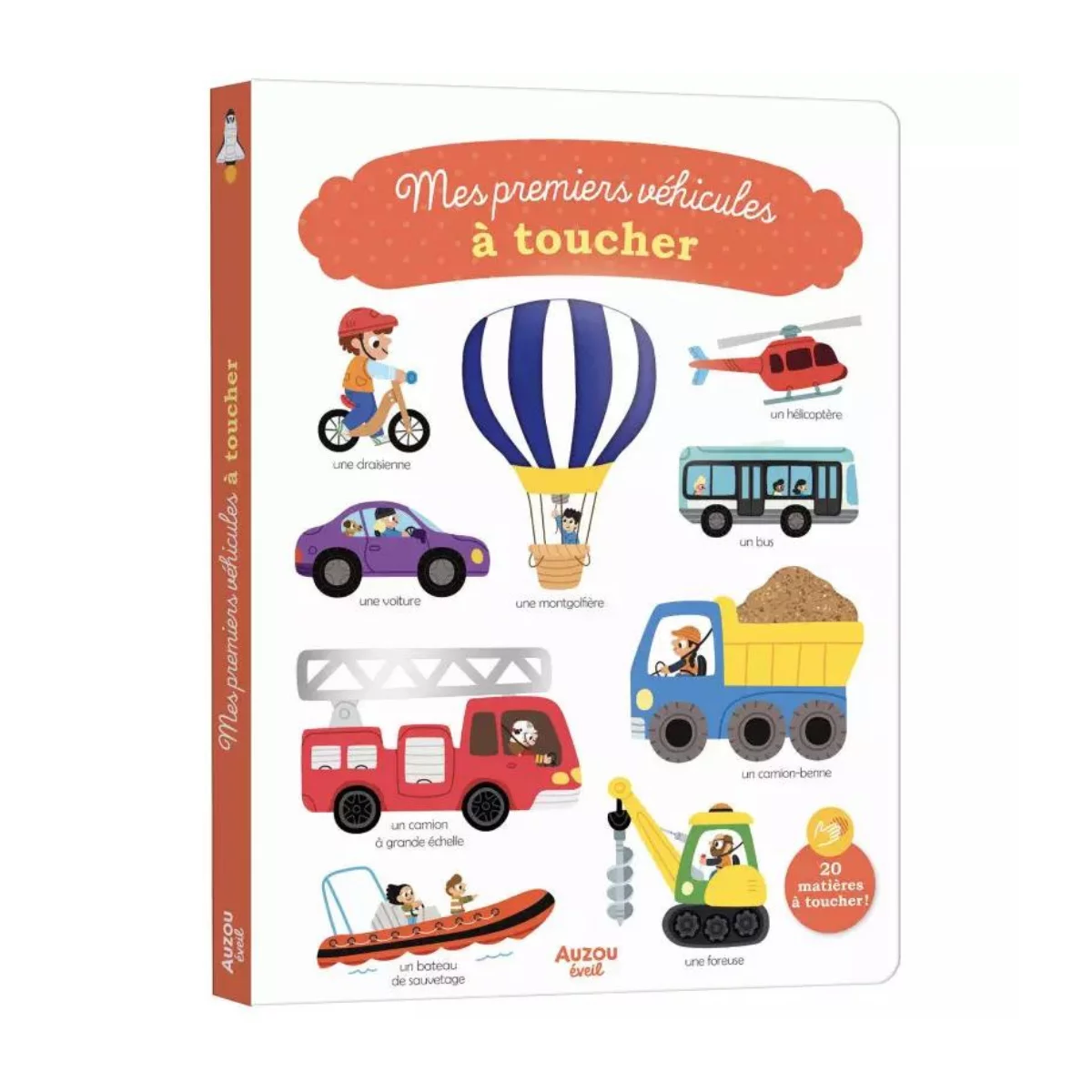 Plus de 20 matières à toucher qui permettent aux petits d’appréhender une nouvelle dimension des objets et mots présentés. Le sens tactile facilite l’appropriation du nouveau vocabulaire et sa mémorisation. Pointer, nommer, enrichir son vocabulaire et développer son sens tactile : un livre d’éveil à manipuler d’abord avec le parent accompagnateur, puis tout seul. Thématiques : En ville Au parc Transports à rails Dans les airs Sur et sous l’eau Au chantier Véhicules d’urgence Sur la route des vacances Imaginaires