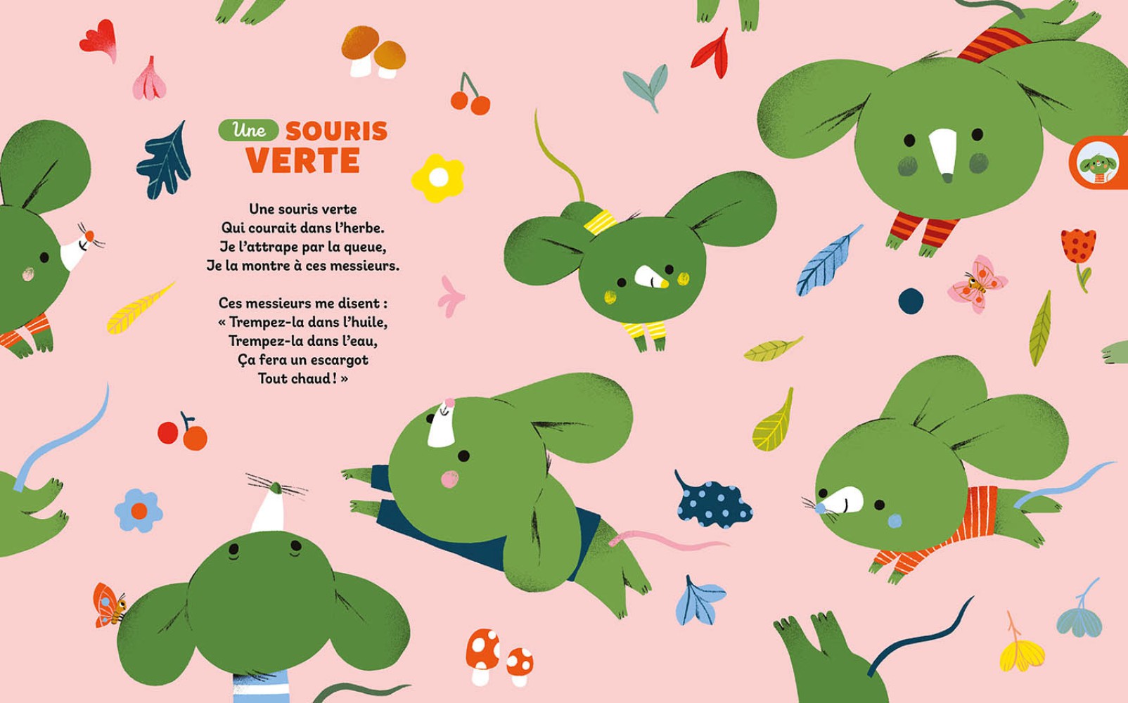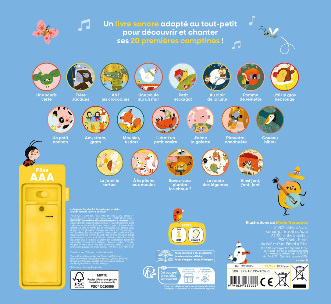 Le livre contient 20 comptines classiques illustrées avec soin, accompagnées de leurs paroles pour chanter en famille : une manière ludique d’enrichir le vocabulaire, de stimuler la mémoire et de développer le sens du rythme. Grâce à son module sonore intégré composé de 20 puces, l’enfant peut écouter facilement chaque comptine d’une simple pression du doigt.