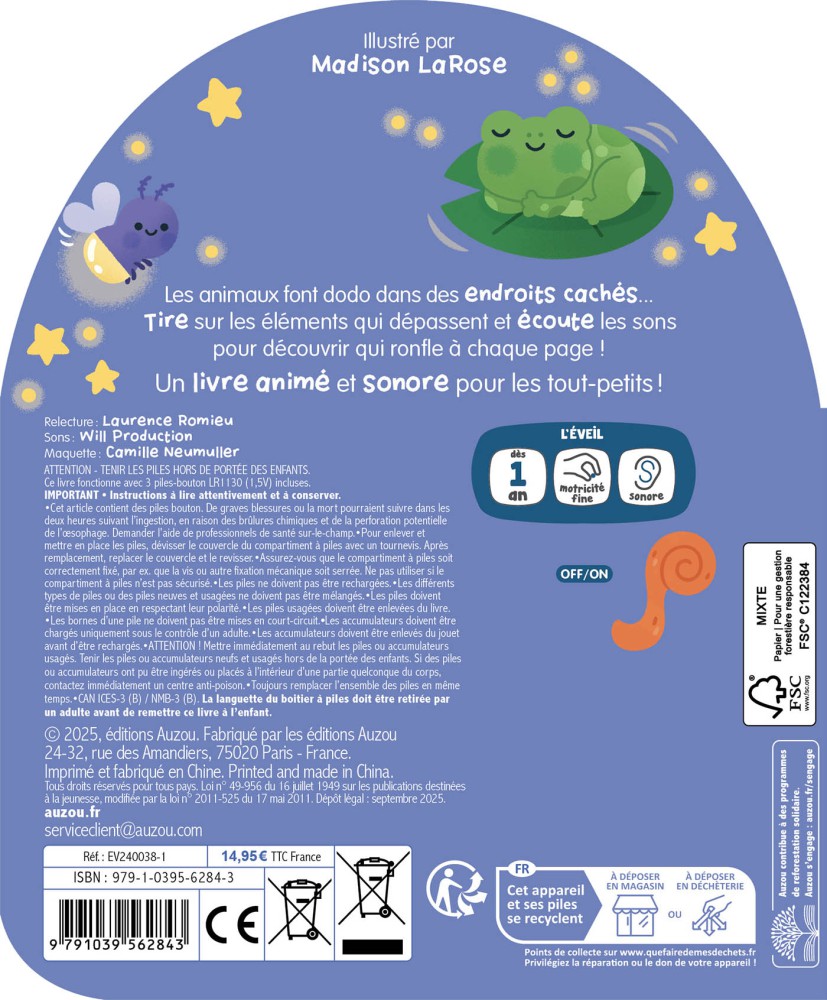 Les animaux jouent à cache-cache dans la nuit… Tire sur les éléments qui dépassent et écoute les sons pour découvrir qui se cache à chaque page. Inédit : du vernis phosphorescent à chaque page pour faire briller le livre dans le noir !