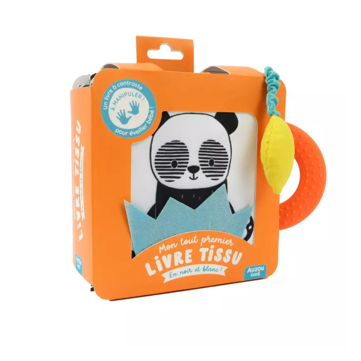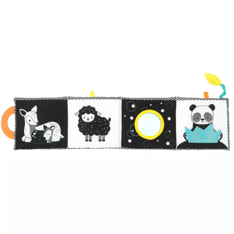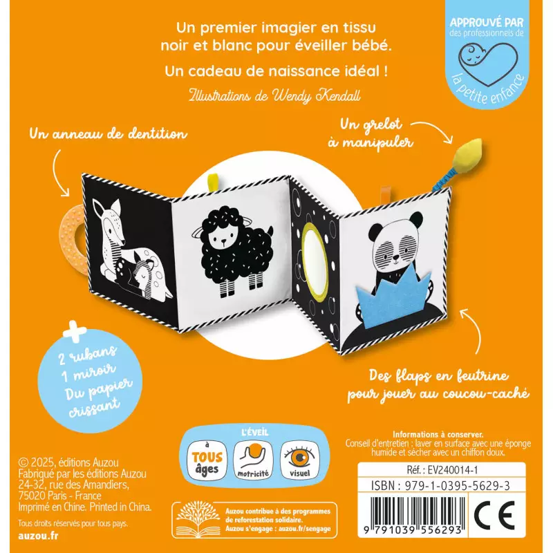 Un livre en tissu en format accordéon, parfait pour l’éveil des tout-petits ! Avec ses contrastes visuels, son miroir, son anneau de dentition, ses flaps en feutrine, grelot et rubans à attraper, il stimule la vue, le toucher et la motricité dès la naissance. Un cadeau de naissance complet et sensoriel !