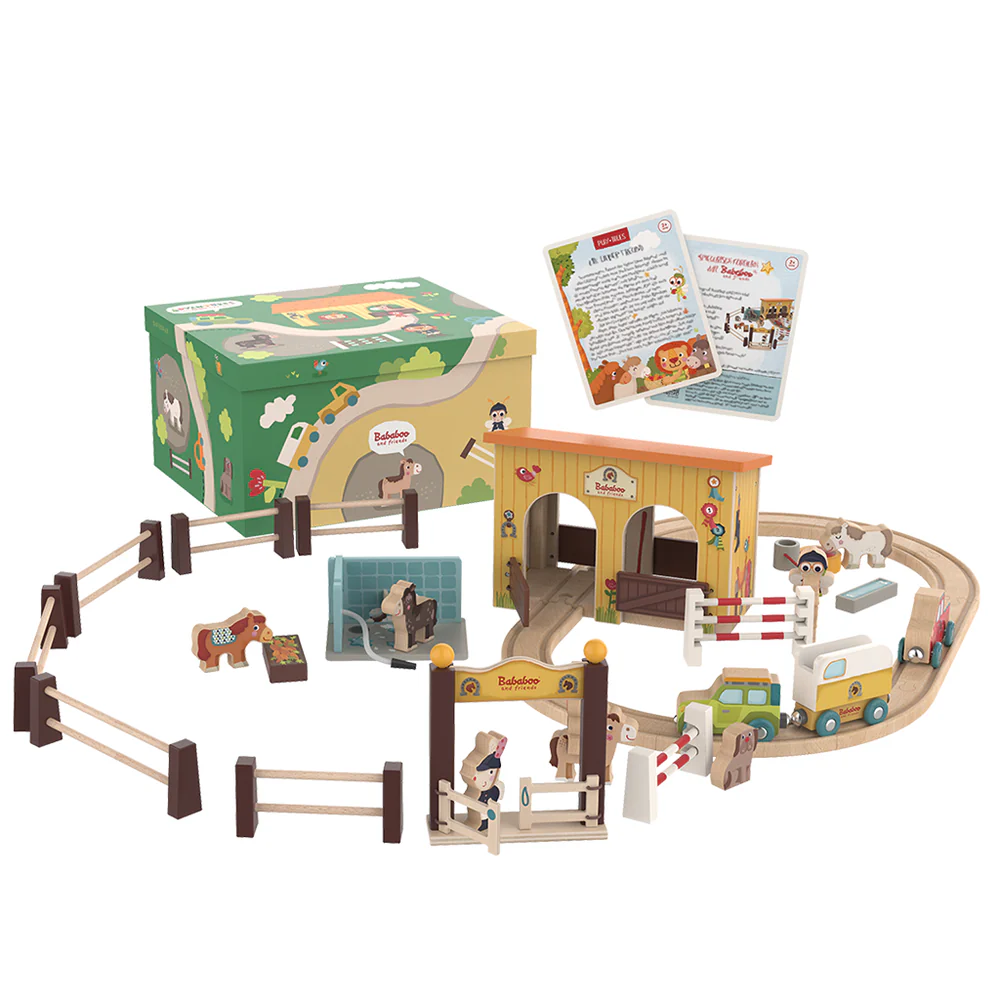Rejoignez Bababoo, Pipa et Miss Mali dans l’univers magique de l’écurie ! Ce jeu en bois comprend une écurie, 2 obstacles, une douche pour cheval, un ring, 9 figurines et 3 véhicules. Les enfants peuvent nourrir les animaux, soigner les chevaux et pratiquer l’équitation. Le jeu inclut aussi une banderole à colorier et une carte PlayTales™. Compatible avec des rails d’autres marques. Idéal dès 24 mois, avec 66 pièces au total. Dimensions : 64,5 x 15,5 x 47 cm.