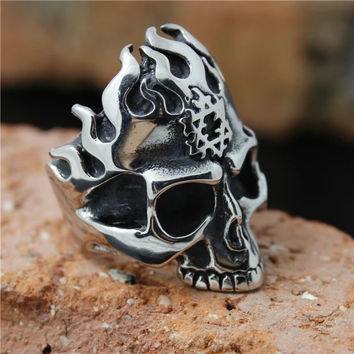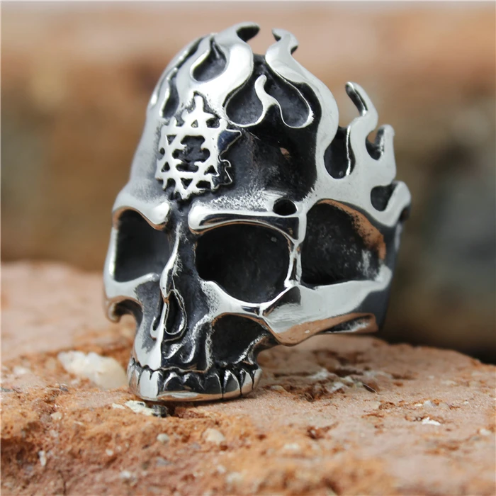 Adoptez un style audacieux avec cette bague en acier pour homme, au design biker. Réalisée en acier inoxydable 316L, son motif de crâne enflammé et sa finition argent vieilli en font un bijou captivant. Robuste et élégant, c’est l’accessoire parfait pour affirmer votre personnalité ou pour offrir un cadeau mémorable.