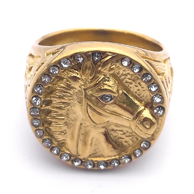 Adoptez la bague tête de cheval en acier doré pour homme. Un bijou puissant, orné de zircons blancs et d’un motif représentant un cheval, symbole de force et de loyauté.