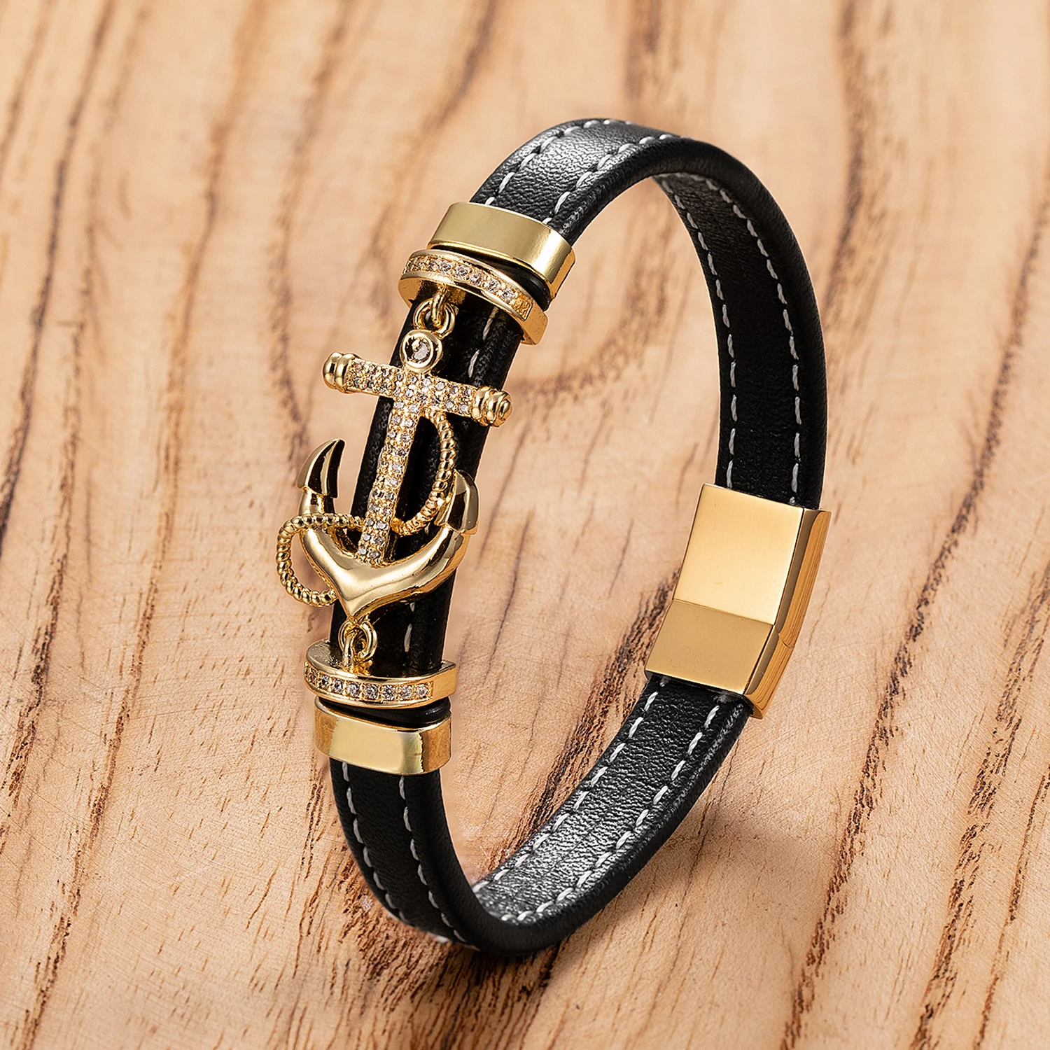 Ce bracelet ancre marin pour homme se distingue par son design en cuir de style punk, agrémenté d’une breloque en forme d’ancre en acier inoxydable. Les petits strass en zircon cubique ornant l’ancre ajoutent une touche de luxe et d’élégance, créant un contraste saisissant avec le cuir robuste. Cette combinaison unique confère au bracelet une allure à la fois audacieuse et sophistiquée, idéale pour ceux qui souhaitent affirmer leur personnalité avec style.