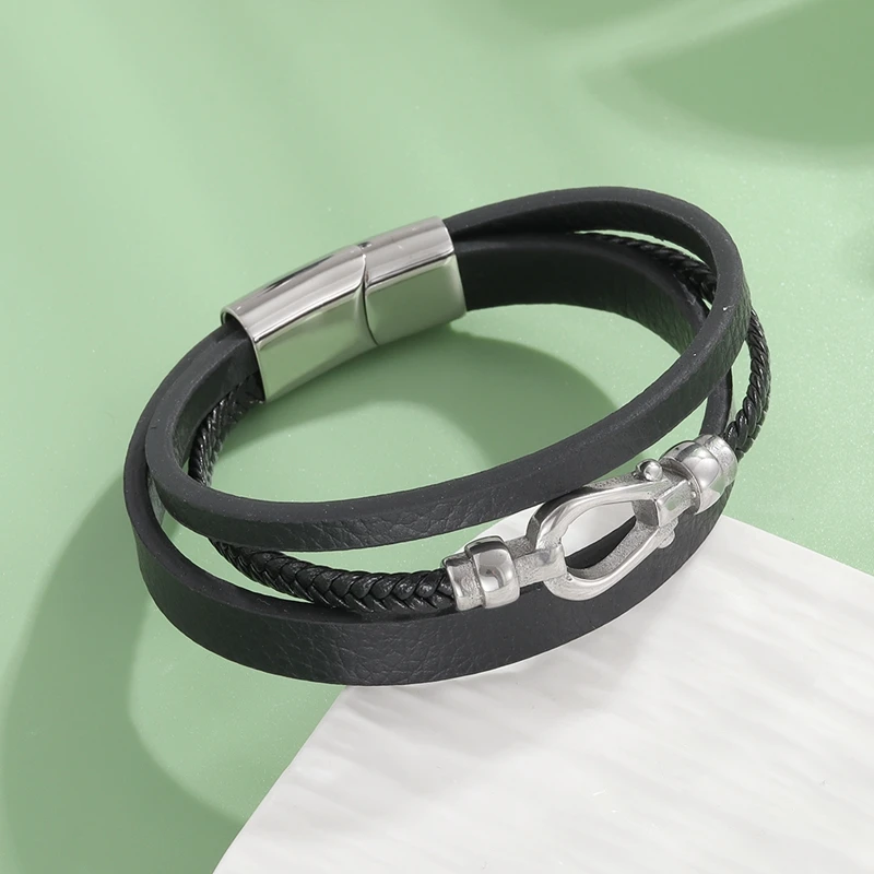 Affirmez votre allure avec ce bracelet argent cuir homme. Trois couches de cuir PU haute qualité, centrale tressée, s’illuminent d’une breloque argentée en acier inoxydable. Le fermoir magnétique se clipse d’un simple geste. Léger, robuste et proposé en plusieurs coloris, il passe du bureau à la ville sans jamais faiblir.