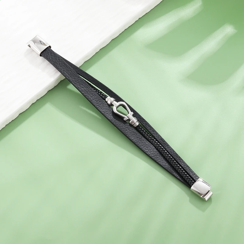 Les lignes sobres rencontrent un détail sophistiqué. Trois bandes de cuir PU noir haute qualité forment un volume équilibré. La couche centrale, finement tressée, crée un jeu d’ombres qui capte la lumière. Une breloque couleur argent, taillée dans de l’acier inoxydable poli, signe le centre de la composition. Le contraste noir‑argent attire l’œil sans ostentation.