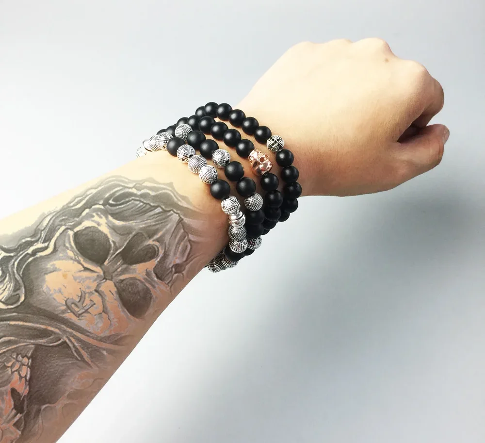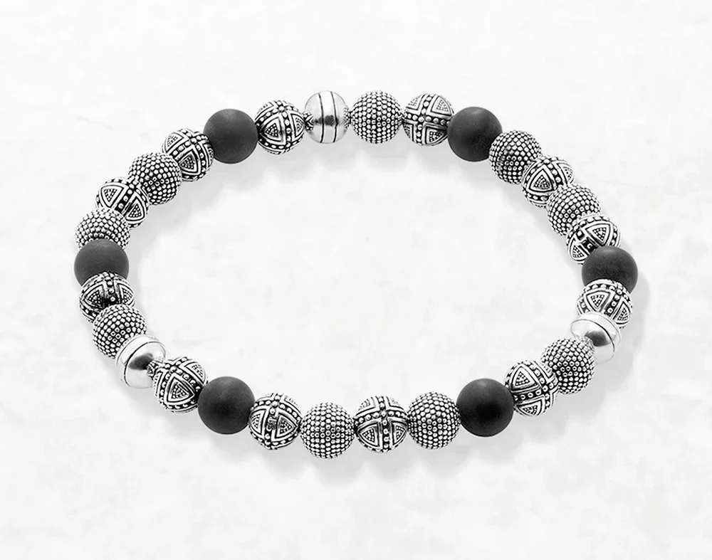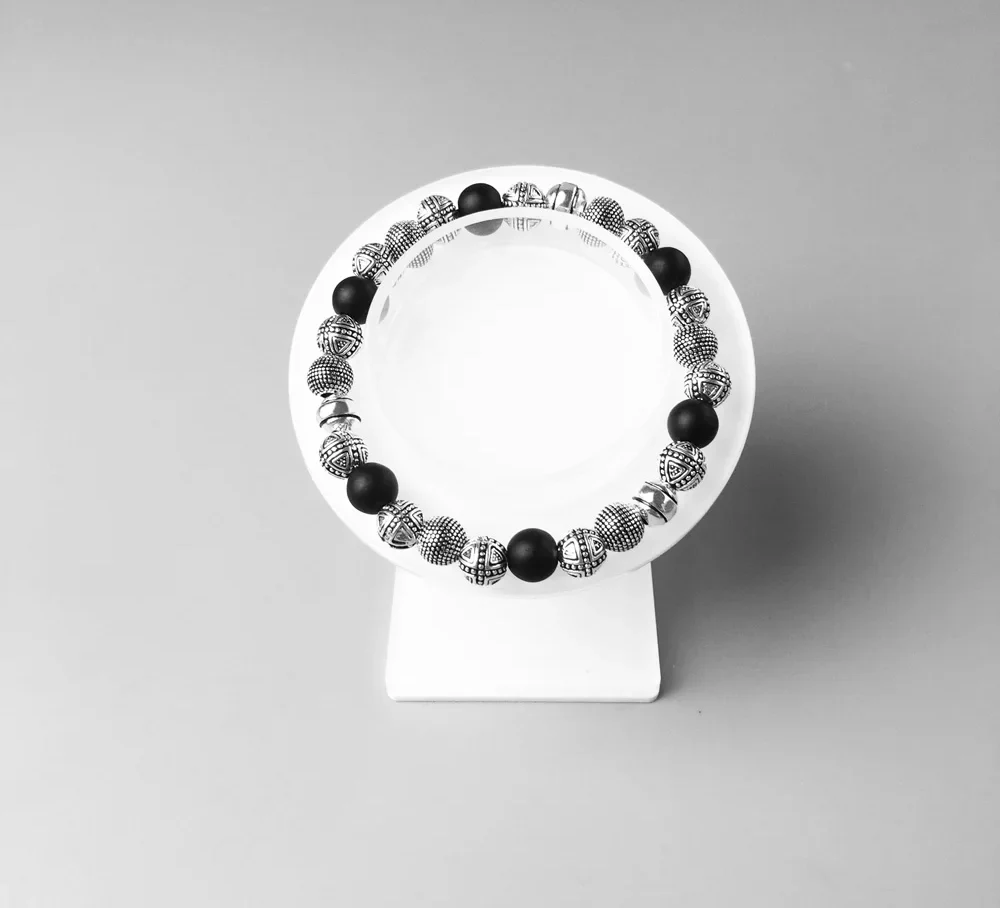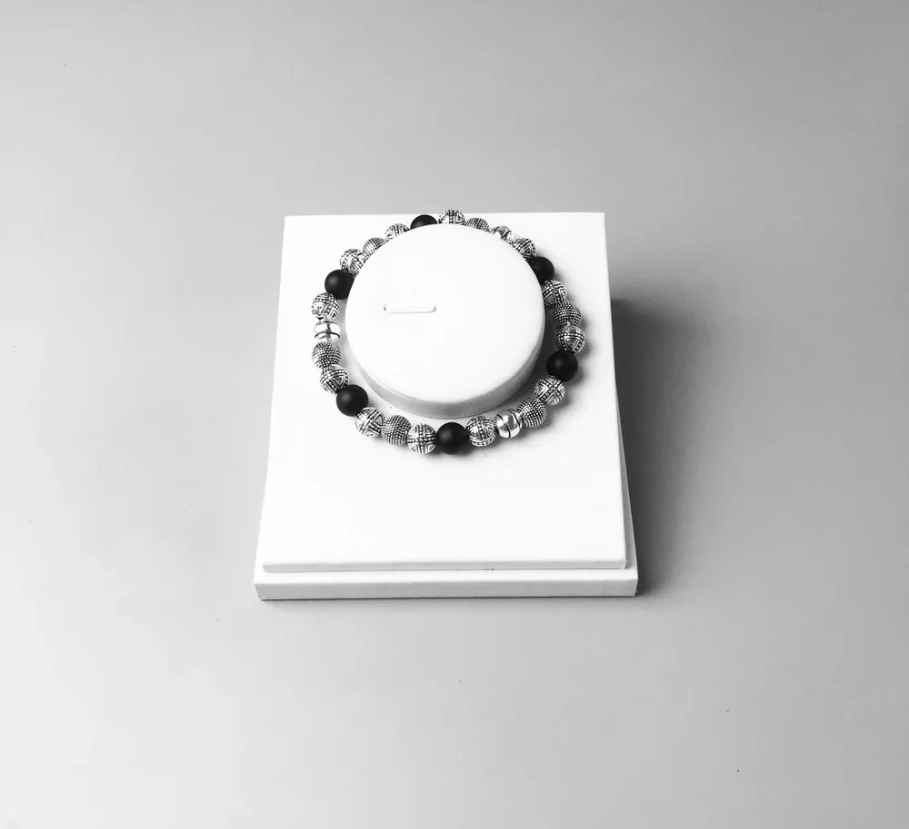 La nuit se fait bijou autour de votre poignet. Des perles d’obsidienne noire, polies miroir, alternent avec des sphères en argent sterling sculptées de quatre motifs exclusifs. Le contraste offre un jeu de lumière subtil : profondes ombres volcaniques contre reflets argentés vibrants. Aucun besoin de fioritures ; l’esthétique parle d’elle-même, élégante et précise.