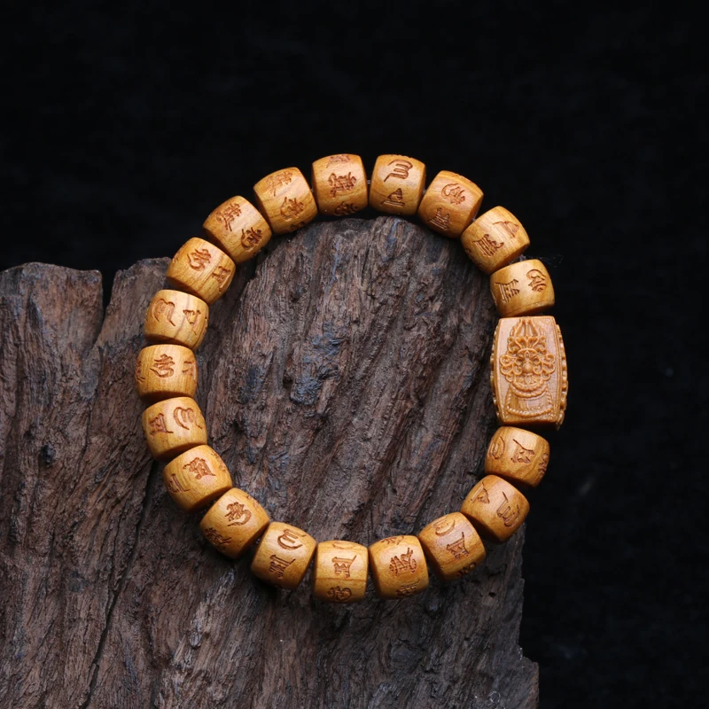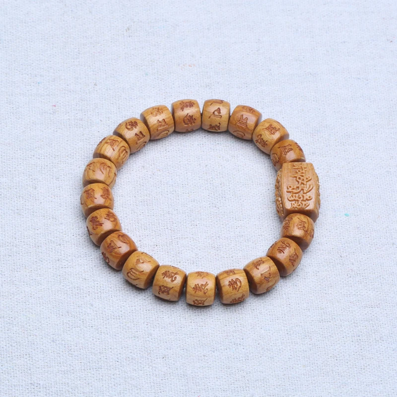 Les perles de bois de santal sont soigneusement travaillées avec des dimensions précises de 10mm d’épaisseur et 11mm de large. Son aspect vernissé offre un fini élégant et discret. Les motifs tibétains ajoutent une dimension spirituelle profonde et significative à ce bracelet.
