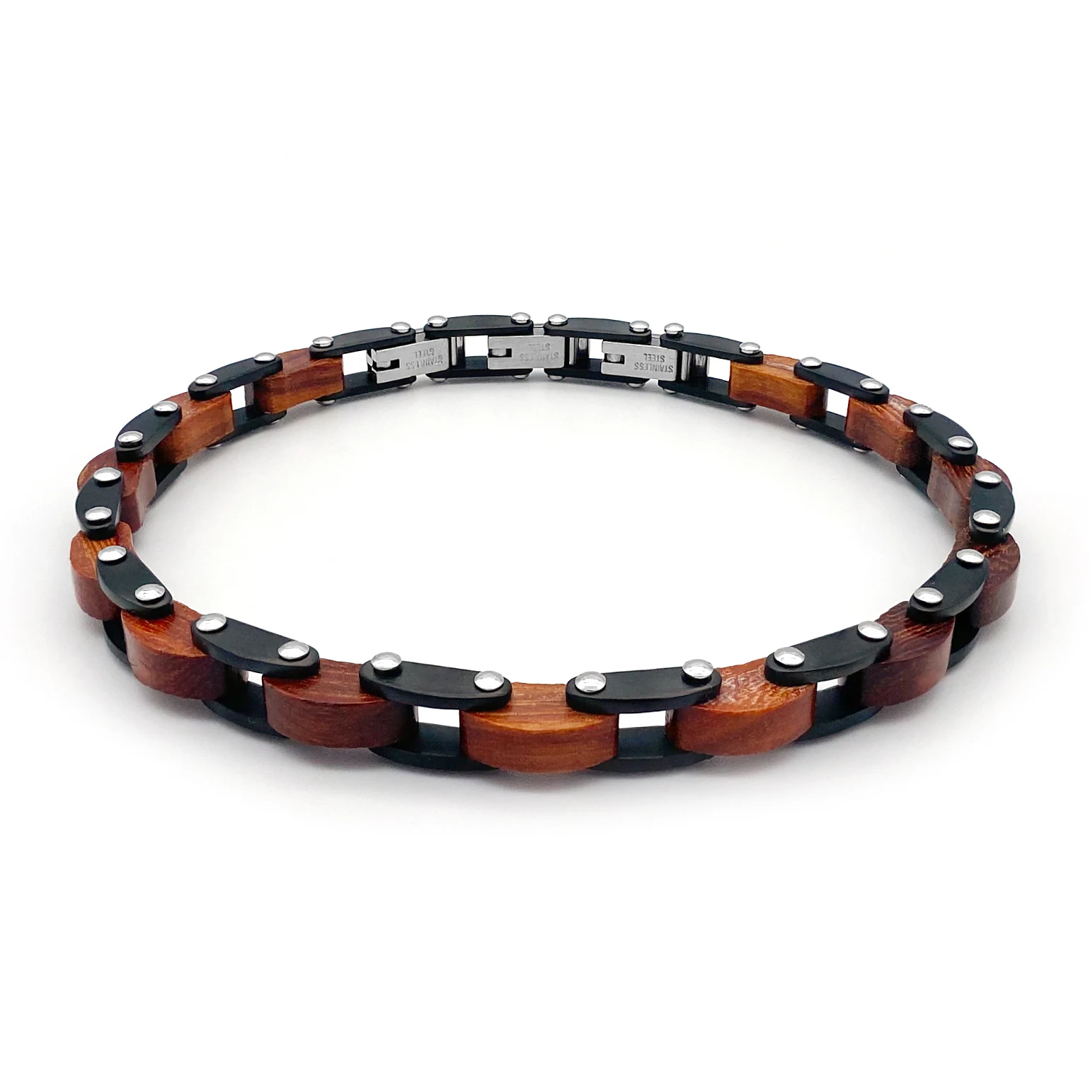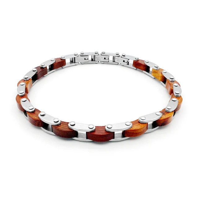 Alliez sophistication et robustesse avec ce bracelet bois et acier. Un design inspiré des chaînes de moto pour affirmer votre style unique.