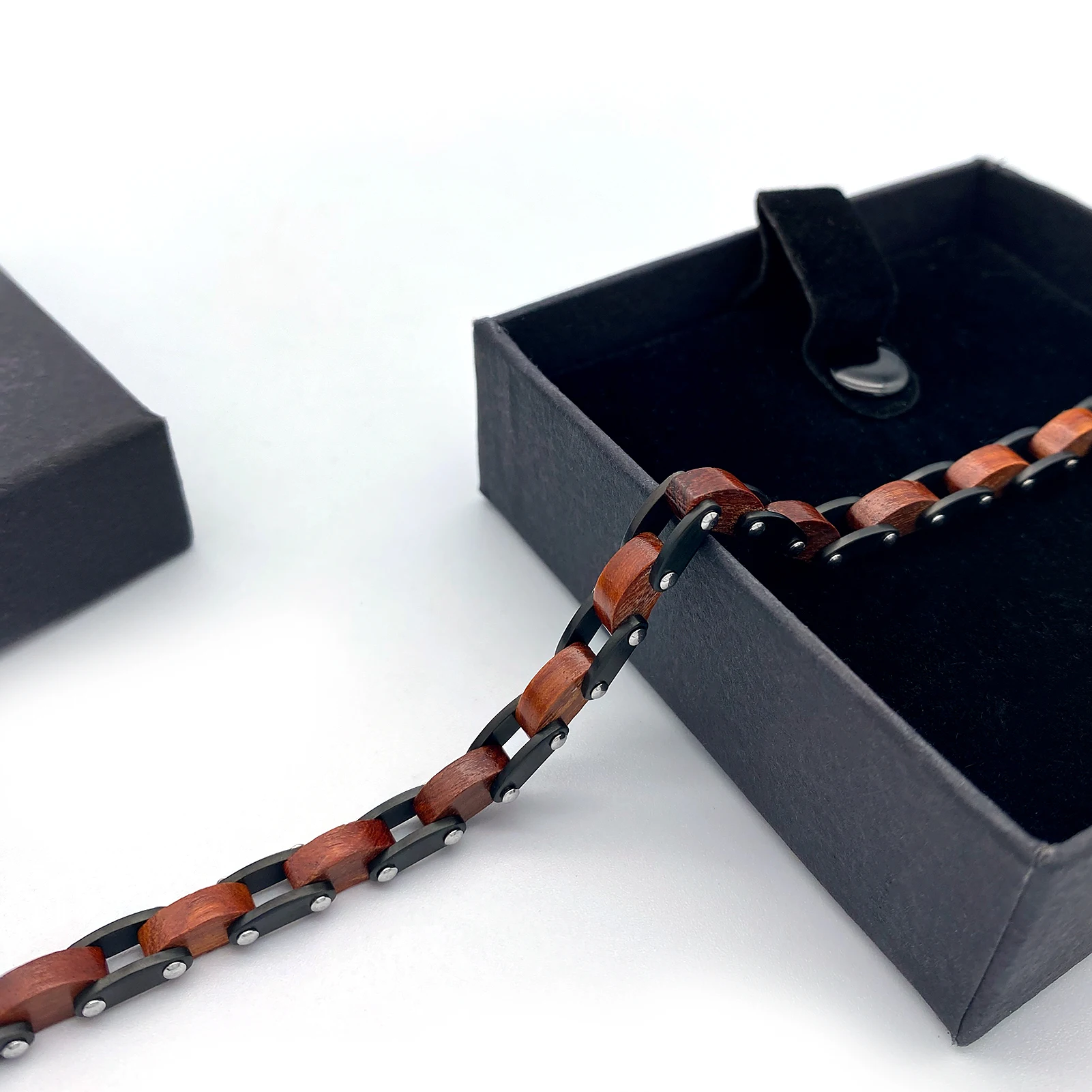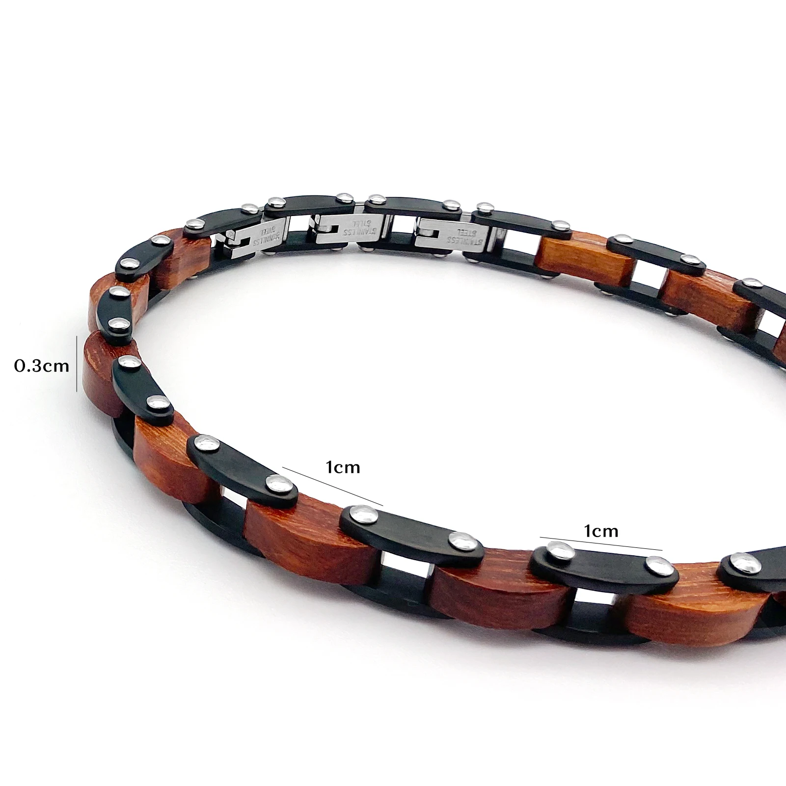 Ce bracelet combine harmonieusement des maillons cubiques en bois et en acier inoxydable. Inspiré des chaînes de moto ou de vélo, son design offre un look moderne et viril. Disponible en deux coloris : noir et bois naturel ou marron et bois, il s’adapte à vos envies. Avec une taille réglable de 22 cm, il garantit un ajustement parfait pour un confort optimal.