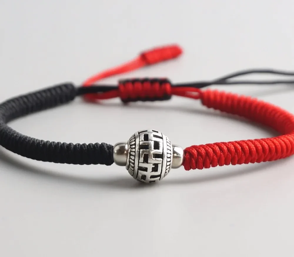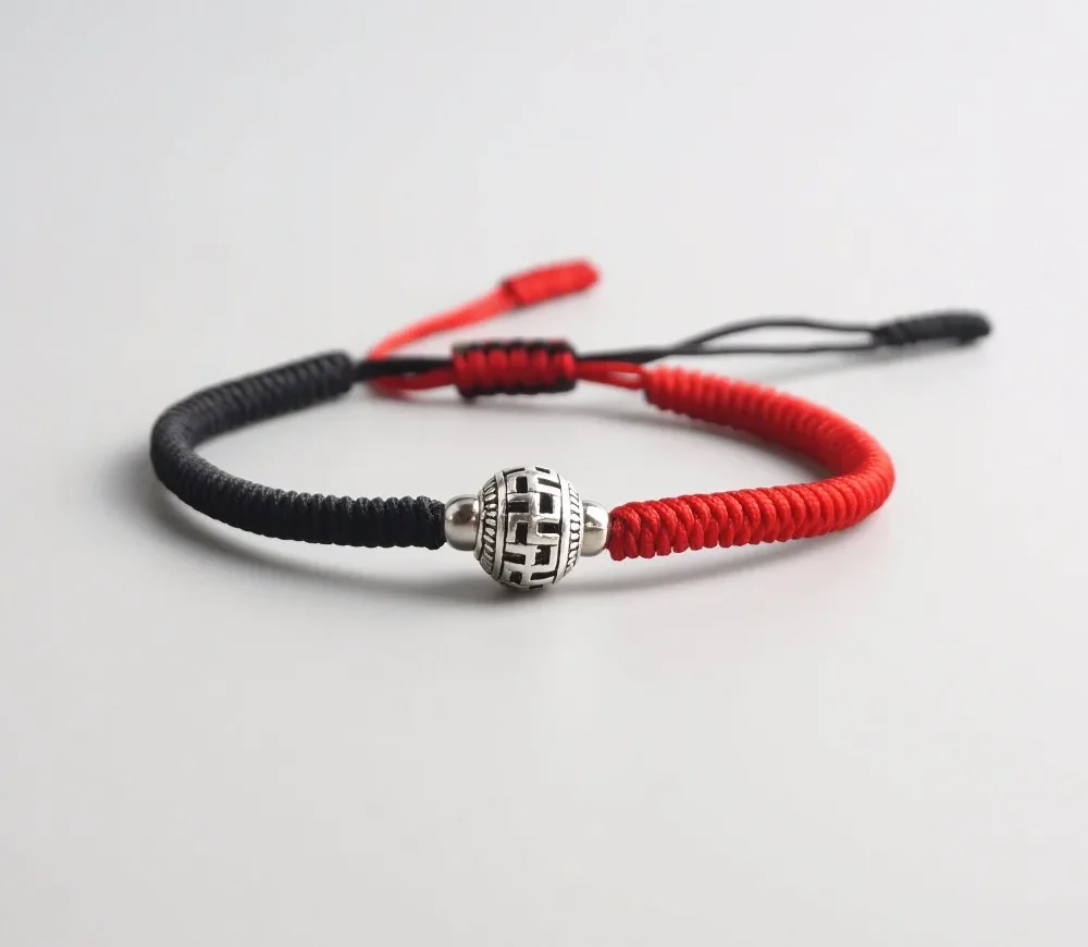 Ce bracelet captivant se démarque par son cordon tressé qui associe avec brio le rouge passion à un noir intense, créant un contraste moderne et visuellement séduisant. La breloque sphérique ornée d’un motif tibétain raffiné apporte une touche d’authenticité et de signification profonde, faisant de ce bijou bien plus qu’un simple accessoire – c’est une déclaration de style et de personnalité.