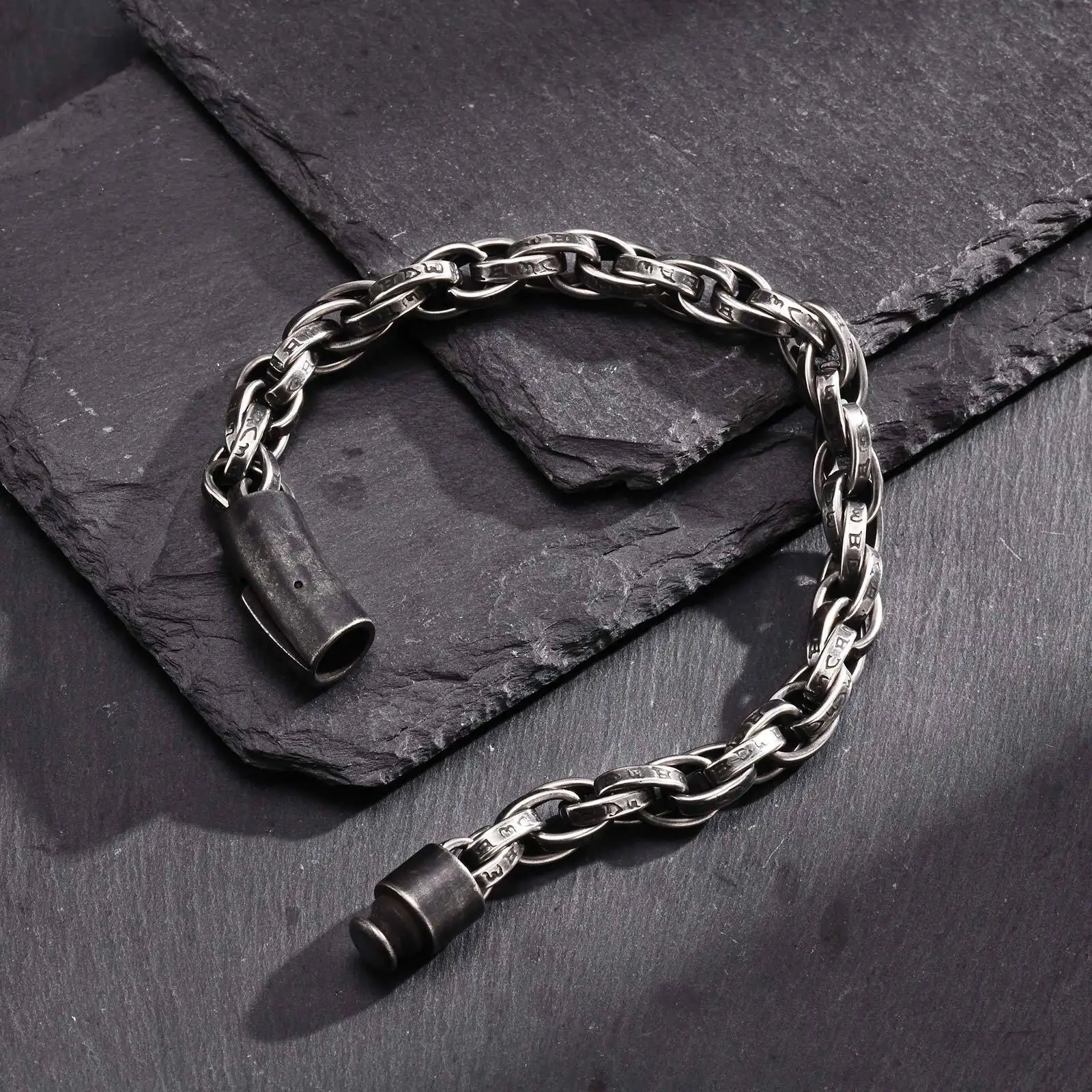 Taillé dans un acier inoxydable de haute qualité, ce bracelet ne craint ni l’usure ni l’épreuve du quotidien. Sa structure massive garantit une sensation de poids authentique, affirmant sa présence au poignet. Résistant à l’oxydation et au ternissement, il conserve son éclat brut au fil des années, comme un héritage transmis à travers les âges.