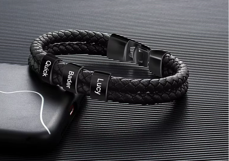 Succombez sous le charme de ce bracelet homme personnalisé cuir, élégant et unique. Son cuir tressé noir s’associe à des plaques gravables en acier inoxydable. Inscrivez les prénoms de vos proches pour créer un bijou chargé d’émotion. Un accessoire intemporel, discret et raffiné, parfait pour affirmer son style tout en portant ceux qui comptent.