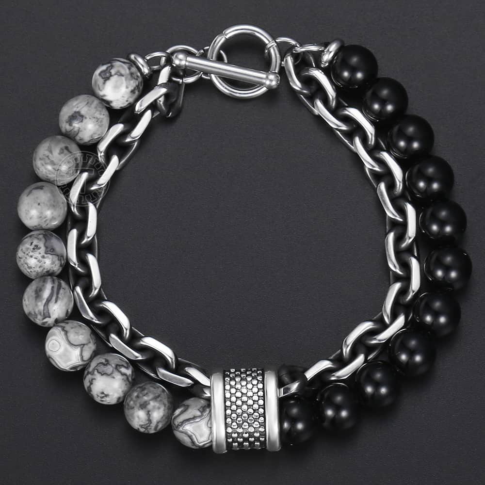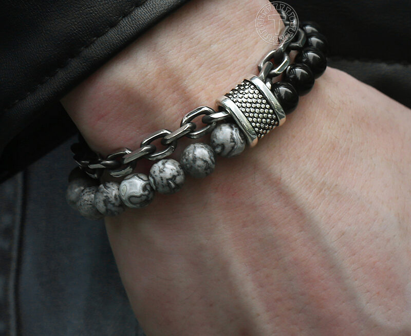 Ce bracelet pour homme composé de chaînes à maille forçat et de pierre naturelle est un bijou au design très masculin idéal pour un look chic et élégant. Ses composantes métalliques sont faites avec de l’acier inoxydable de haute qualité qui ne change pas de couleur. La pierre naturelle n’apporte pas seulement du charme à ce bijou, elle apporte également des bienfaits au corps et au moral de son porteur.
