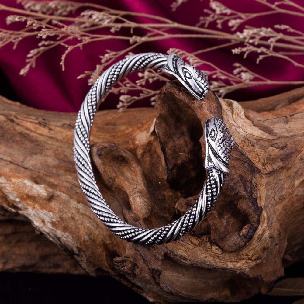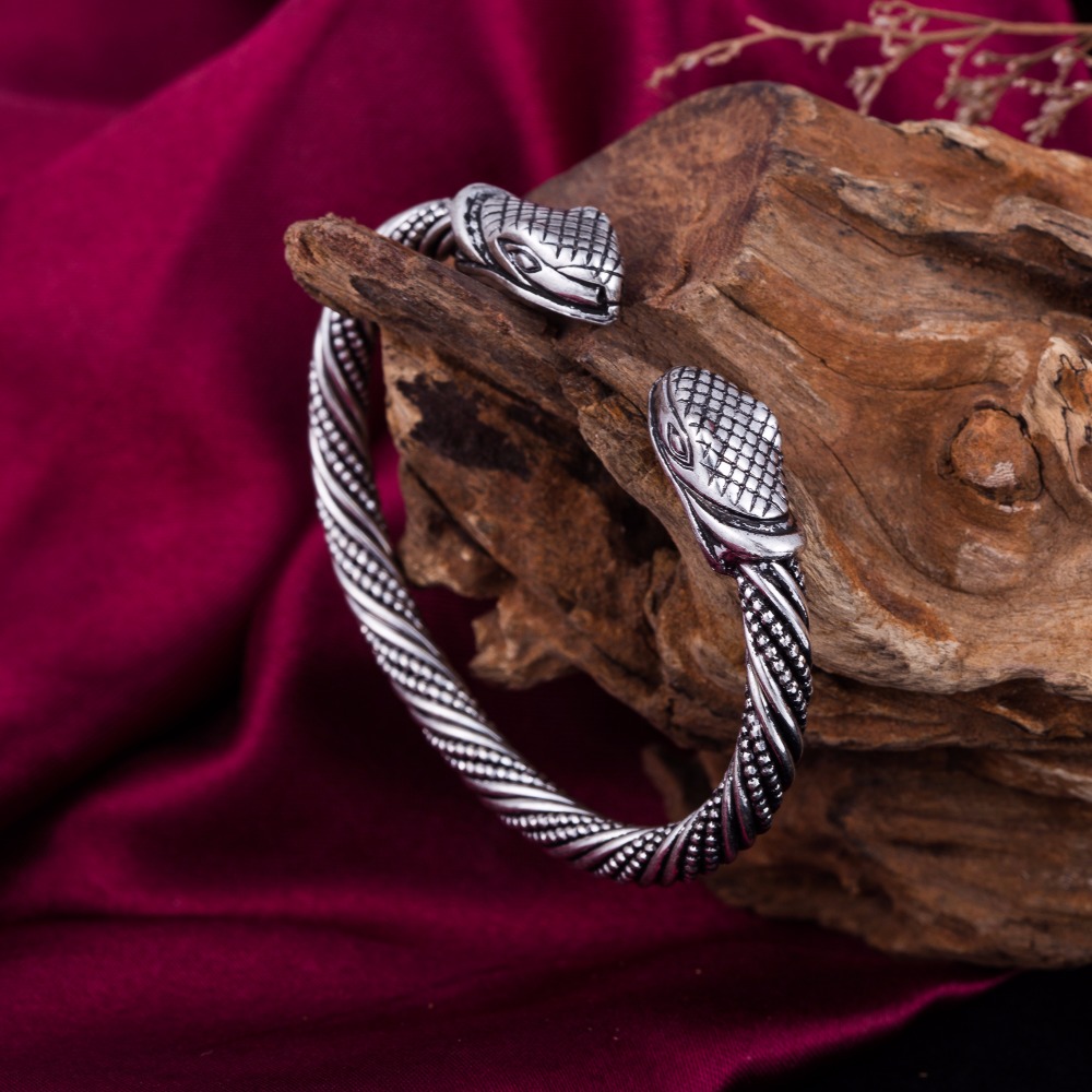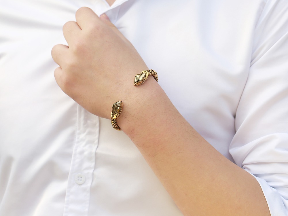 Ce bracelet jonc en forme de serpent inspire la classe tant par son design bien sculpté que par ses deux têtes de serpent menaçantes. Il mettra votre poignet en valeur et ne manquera pas d’attirer l’attention. Son design en forme de manchette vous permet de l’ajuster à votre poignet comme vous le souhaitez.
