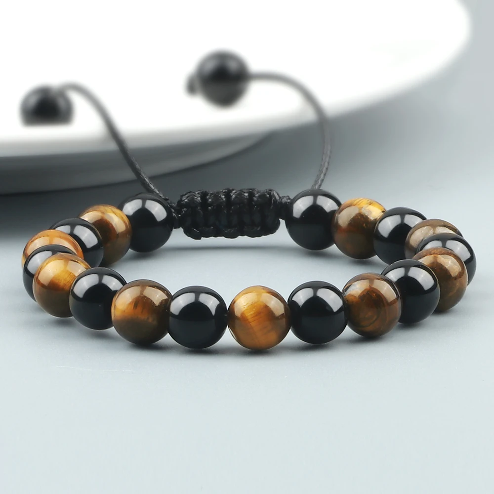 Ce bracelet combine les bienfaits protecteurs de l’obsidienne avec la force apaisante de l’œil de tigre. Les pierres naturelles sont finement polies pour offrir une texture agréable au toucher. Son design discret mais affirmé s’accorde facilement avec toutes vos tenues, qu’elles soient décontractées ou plus habillées.