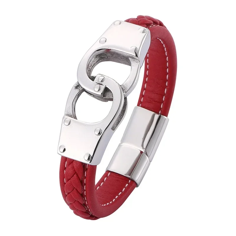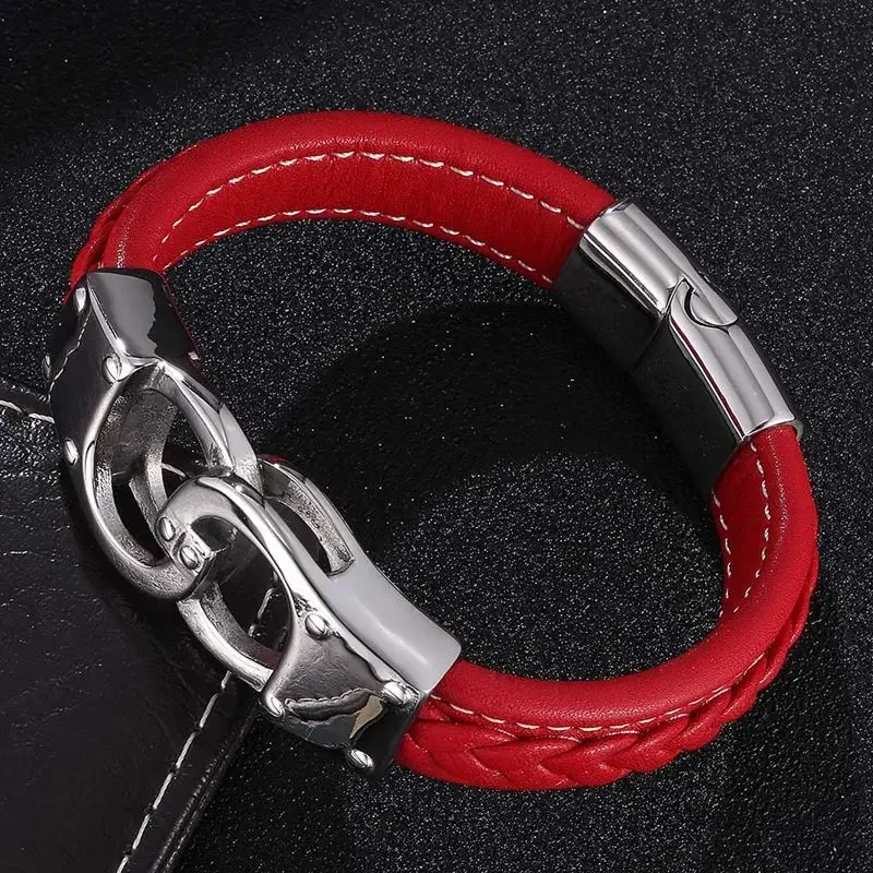Ajoutez du caractère et de l’élégance à votre style avec le bracelet menotte rouge. Fabriqué en cuir tressé rouge, il allie audace et modernité. Son fermoir magnétique en acier inoxydable garantit confort et praticité, tandis que ses détails argentés ajoutent une touche sophistiquée.