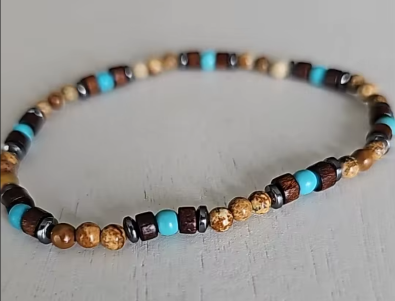 Ajoutez une touche estivale à votre tenue avec ce bracelet perles heishi, parfait pour un look décontracté et ensoleillé. Ce bijou associe harmonieusement des perles plates et rondes en bois et pierres naturelles, dans des teintes vibrantes de marron, bleu turquoise et gris. Son design rappelle l’esprit libre et coloré des plages et des surfeurs.