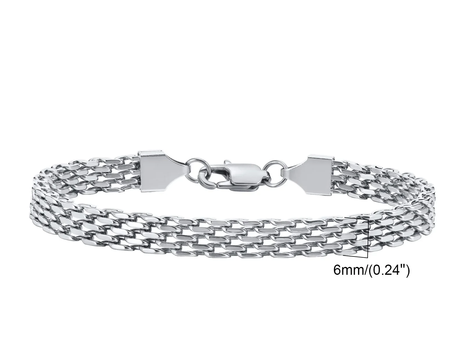 Avec ses maillons en maille italienne de 6 mm, ce bracelet en acier inoxydable incarne la finesse et la modernité. Sa finition brillante capte délicatement la lumière, ajoutant une touche sophistiquée à votre poignet. Son design minimaliste et équilibré en fait un accessoire discret, mais toujours élégant.