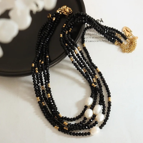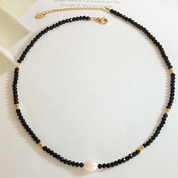 - Matériaux : Perle d’eau douce, acier inoxydable et perles de verre noir