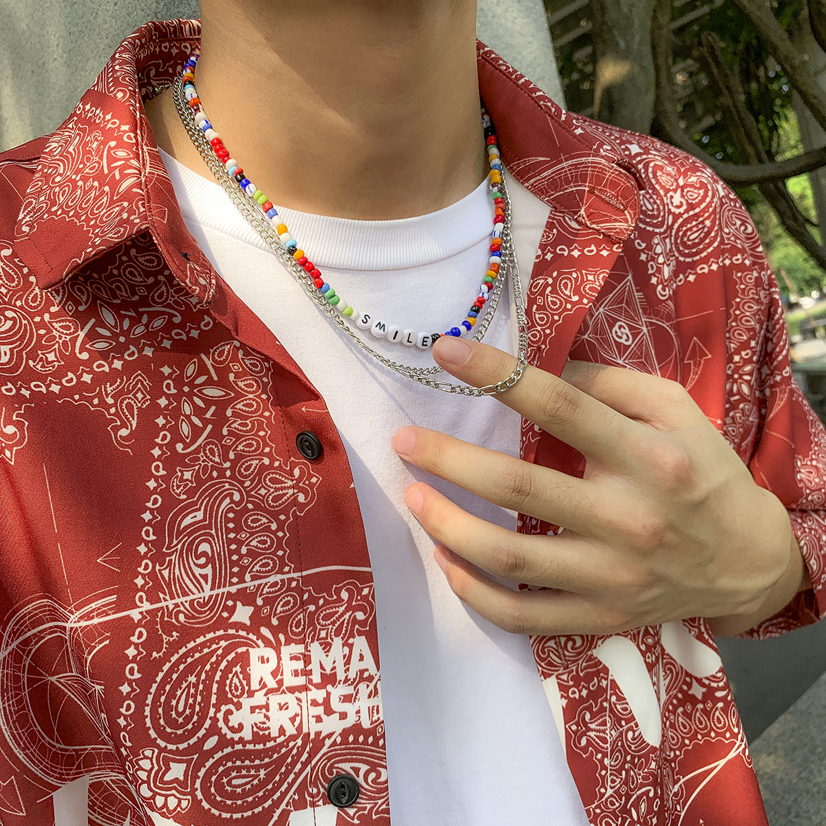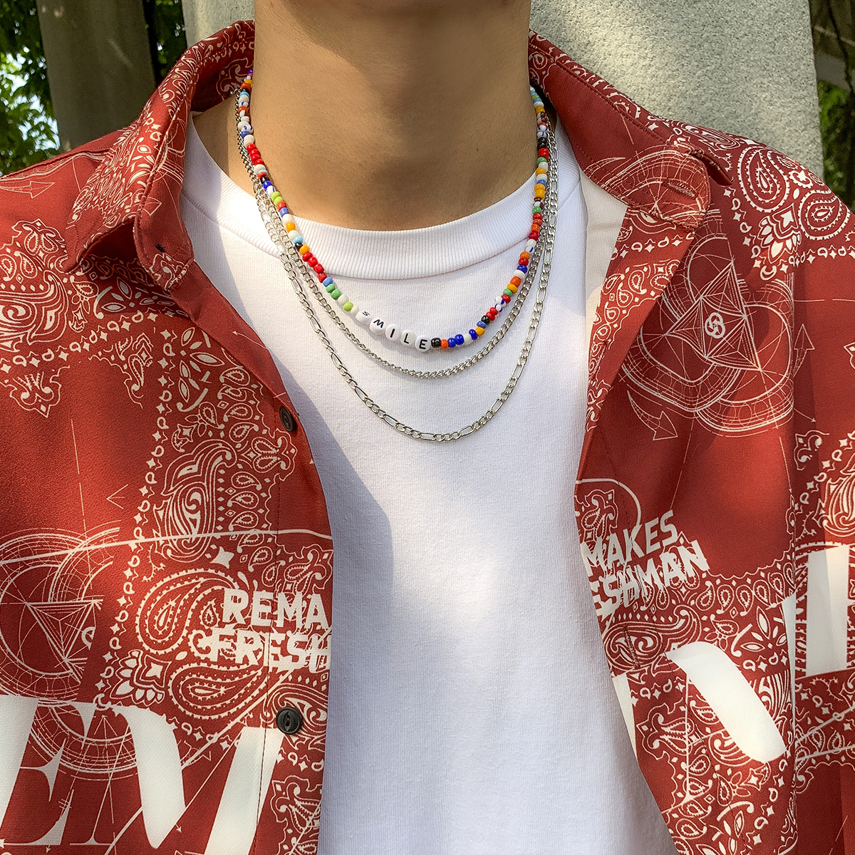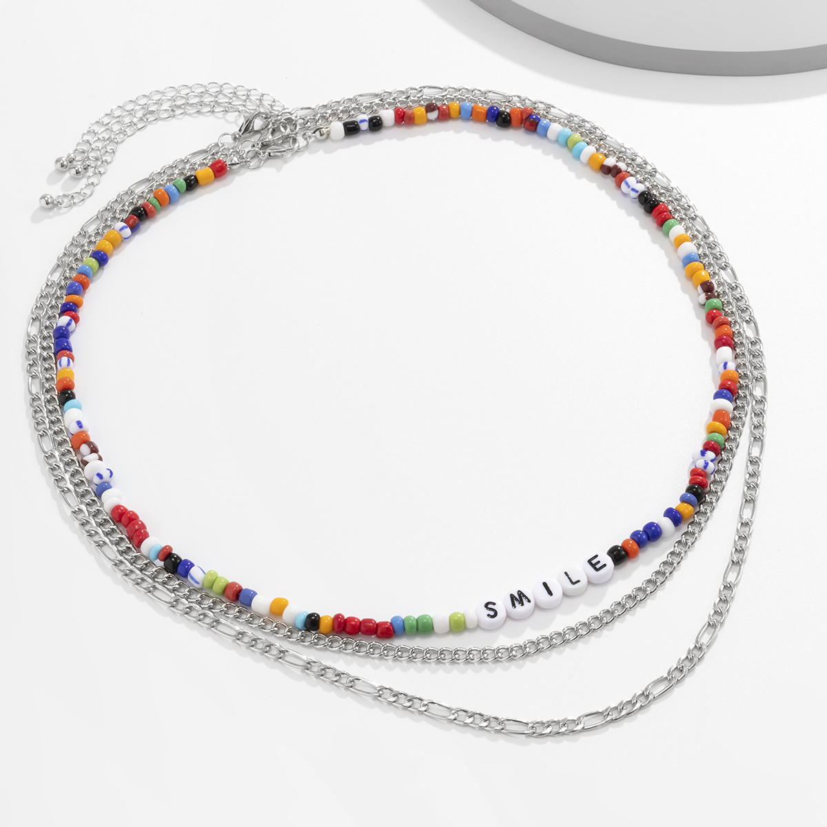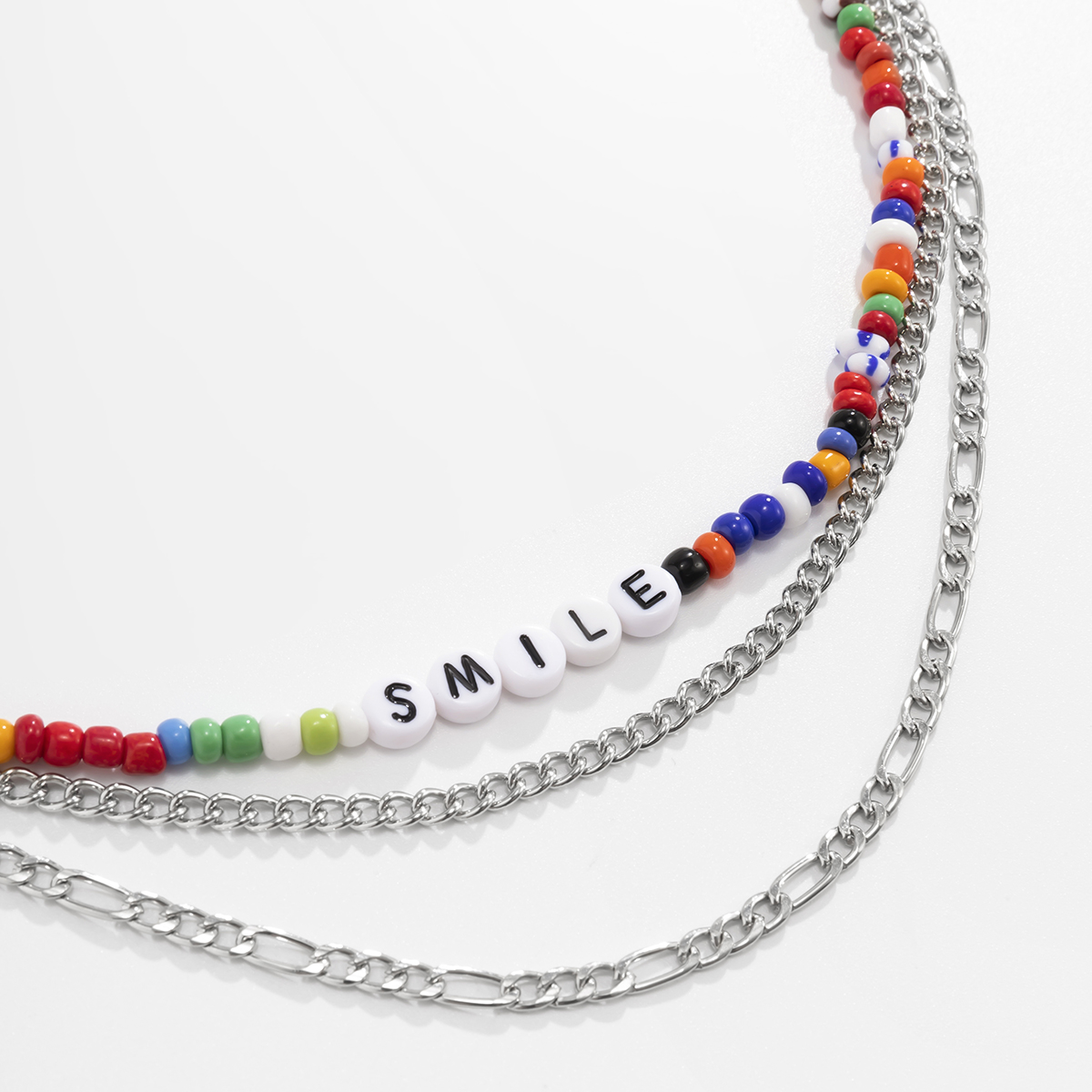 Retrouvez dans ce collier coloré une fusion de style punk et bohème, un bijou qui incarne l’élégance. Ce modèle se compose de trois pièces, dont une ornée de petites perles multicolores et deux chaînes en métal argenté, offrant un mélange à succès. Le mot « SMILE » qui illumine ce collier renforce son style et projette une image de positivité et de gaieté. Avec ce bijou autour du cou, vous partagerez le bonheur et ferez fondre les cœurs.