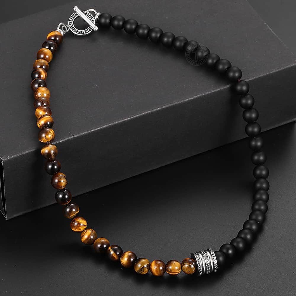 Ce collier bicolore et bimatière est le bijou tendance du moment. Avec une moitié en perle de verre noir et l’autre moitié en œil de tigre gris tacheté, il est au summum du style. Un modèle très masculin, ce collier élégant convient parfaitement aux événements chics tout comme à vos tenues décontractées du quotidien.