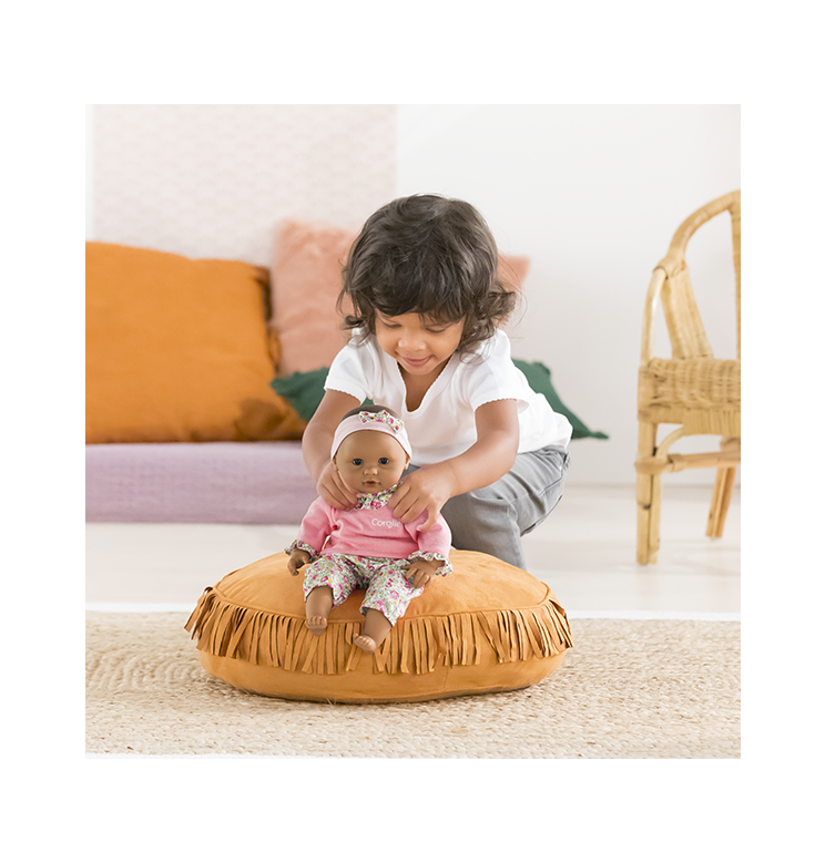 Maria, avec sa peau caramel et ses jolis yeux noirs, est vêtue d’une charmante tenue 2-en-1 : un pantalon fleuri associé à un T-shirt rose à manches longues, complétés par un bandeau assorti. L’enfant peut habiller et déshabiller facilement son poupon grâce aux bandes auto-agrippantes, favorisant son autonomie et le développement de sa motricité fine.