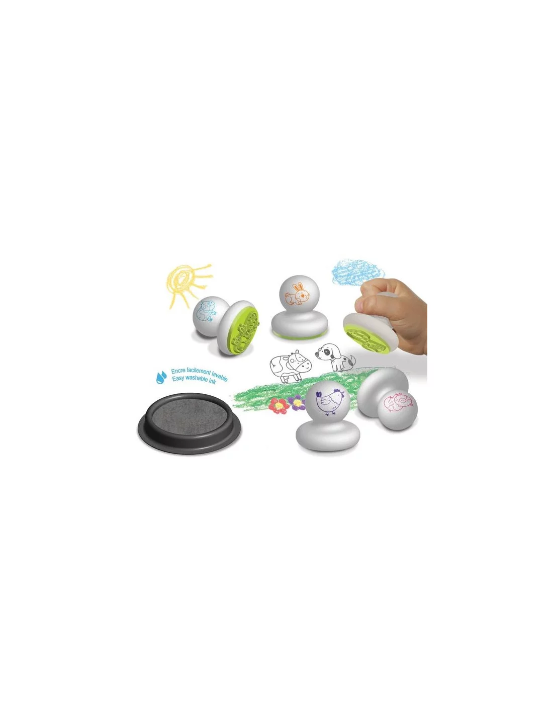 Coffret Mes premiers tampons Animaux de la ferme – Créalign’ Un coffret créatif parfait dès 1 an ! Avec 5 tampons en mousse ergonomiques (lapin, vache, cochon, poule, chien) et un encreur maxi format, votre enfant s’amuse à créer et colorier ses animaux préférés. Faciles à prendre en main et sécurisés, ces tampons développent la motricité et l’imagination des tout-petits. Un jeu d’éveil artistique idéal pour les premières créations !