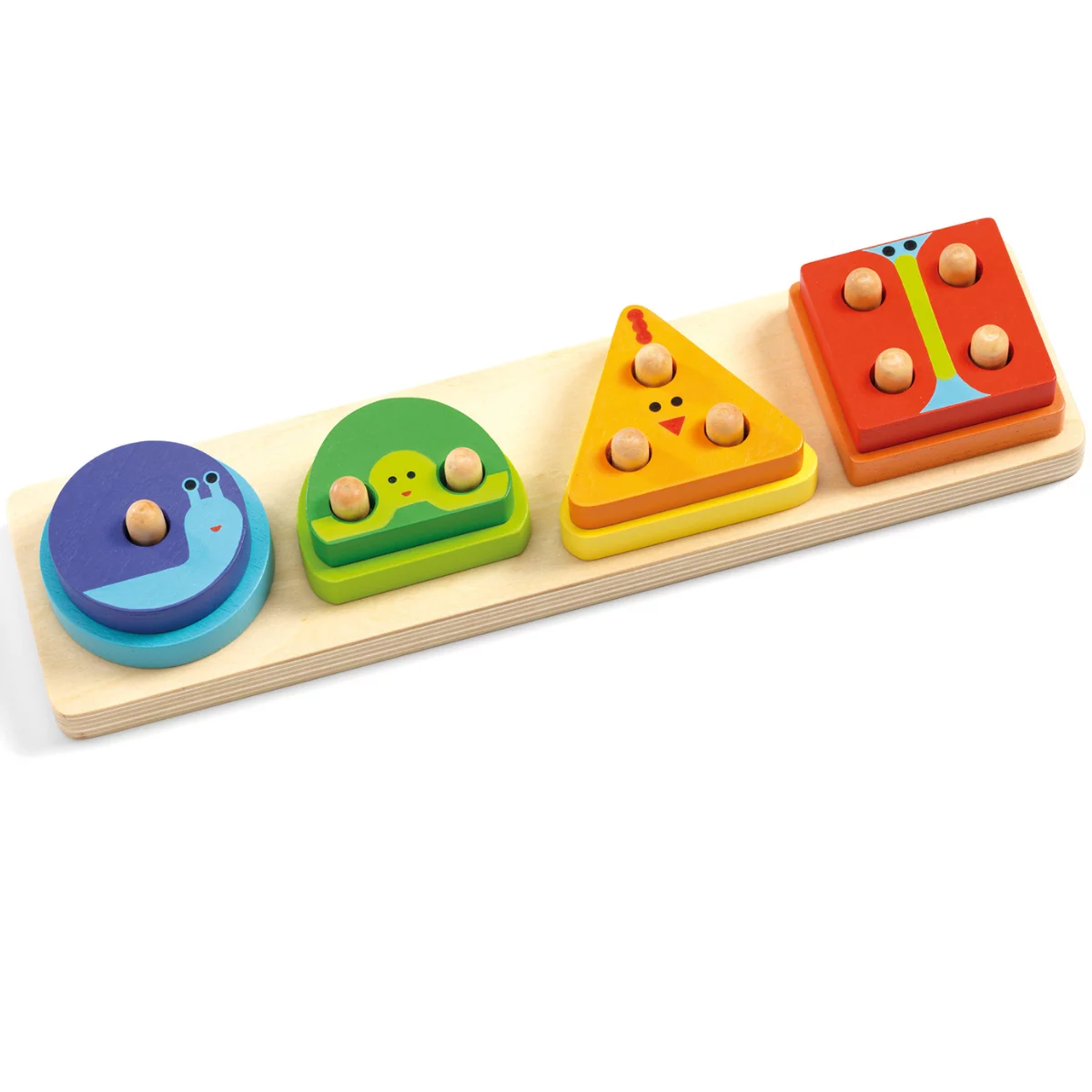 Un tout premier jeu d’encastrement en bois pour sensibiliser les tout-petits aux formes et aux couleurs, dès 12 mois. L’enfant s’amuse à encastrer et empiler sur le plateau. 4 animaux à découvrir : un escargot, une tortue, une poule, une coccinelle.