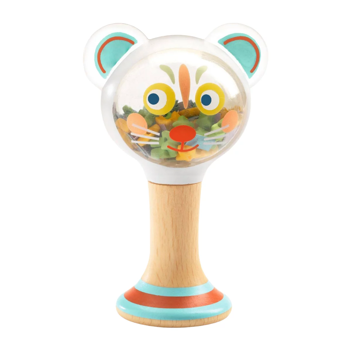 C’est un hochet très coloré et solide, en bois avec des petites billes de toutes les couleurs à l’intérieur. Son socle évasé lui permet de tenir debout tout seul. Premier jouet d’éveil sonore, votre bébé le secoue, l’observe et écoute le mouvement des billes !